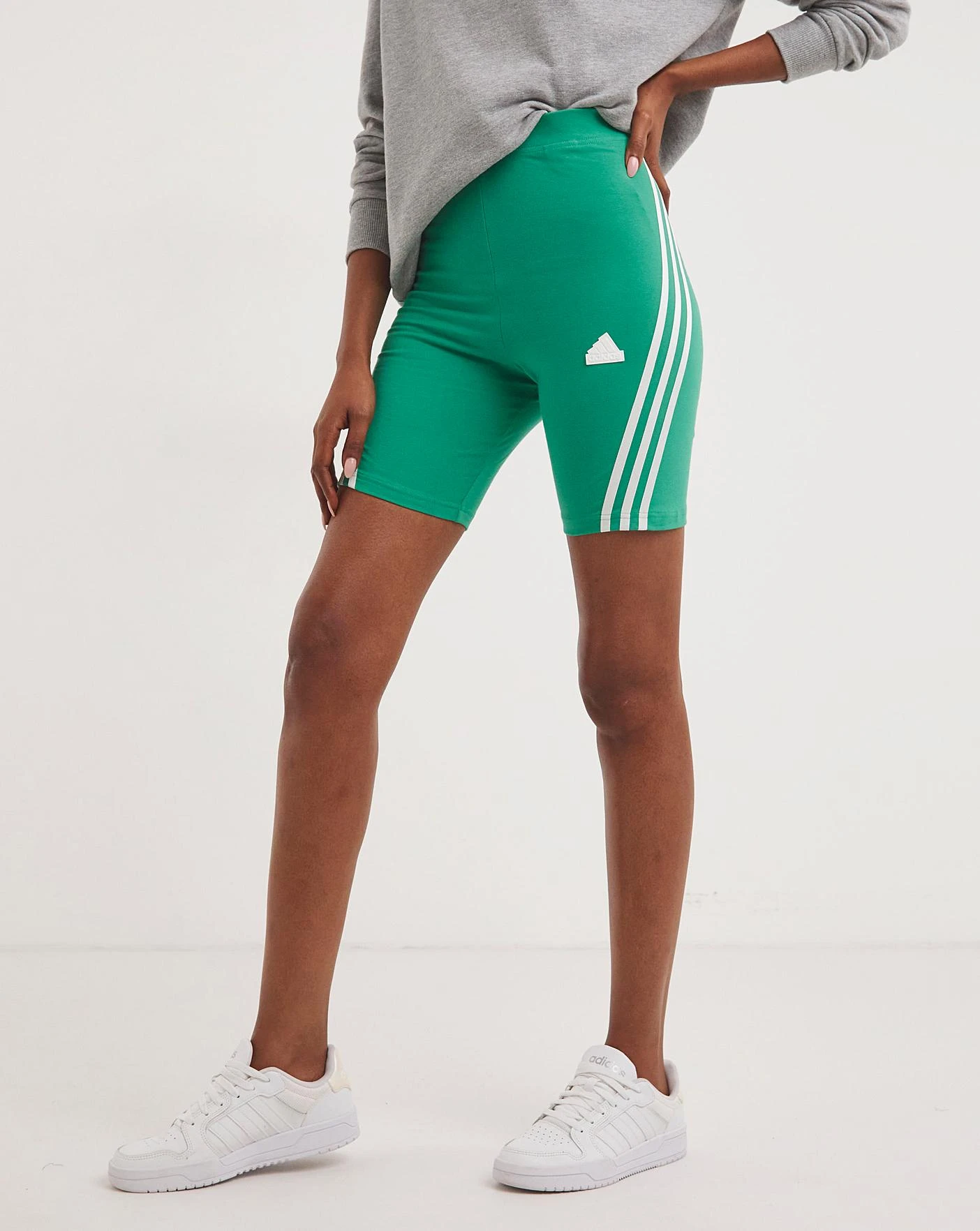 Feel at ease in these comfy adidas bike shorts. The soft, stretchy cotton fabric makes them ideal for everyday wear. The high-rise waist stays put and sits flat against your core, while 3-Stripes wrap both sides for a sporty look. Our cotton products support more sustainable cotton farming.