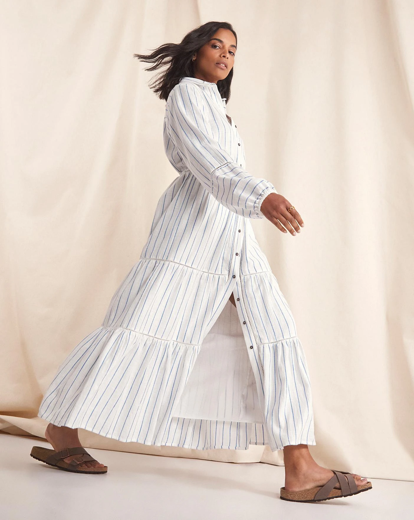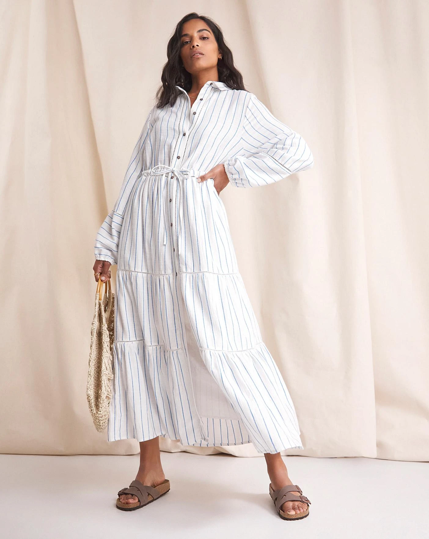 Step into summer with our lightly striped Willow maxi dress. Her adjustable tie waist, tiered silhouette and soft breathable cotton ensure plenty of freedom to move in warmer weather.Complete with feminine lace trims, soft volume sleeves and coconut button fastenings, this premium style will become a wardobe staple. Wear with sandals and a straw tote bag for a stylish seasonal look.