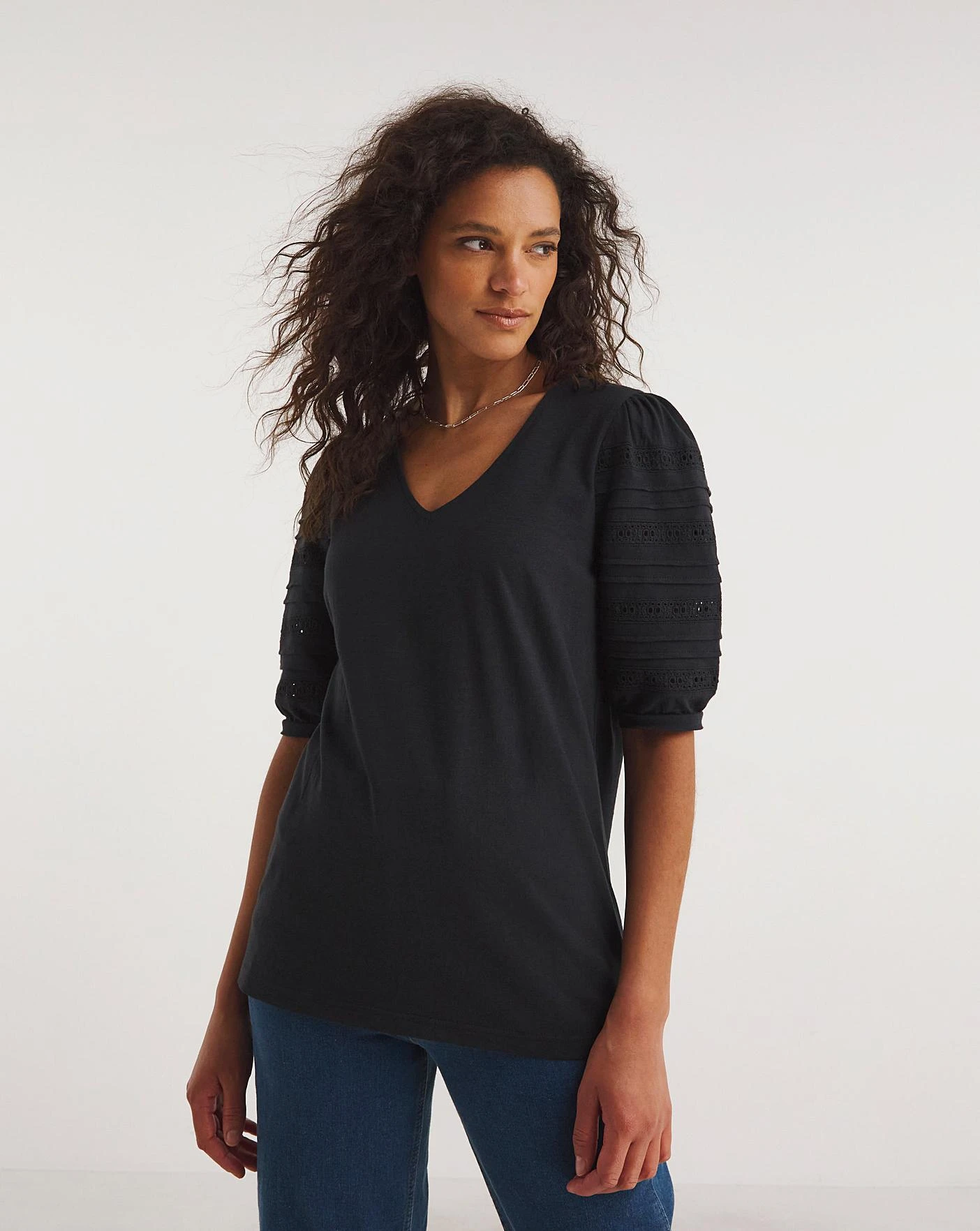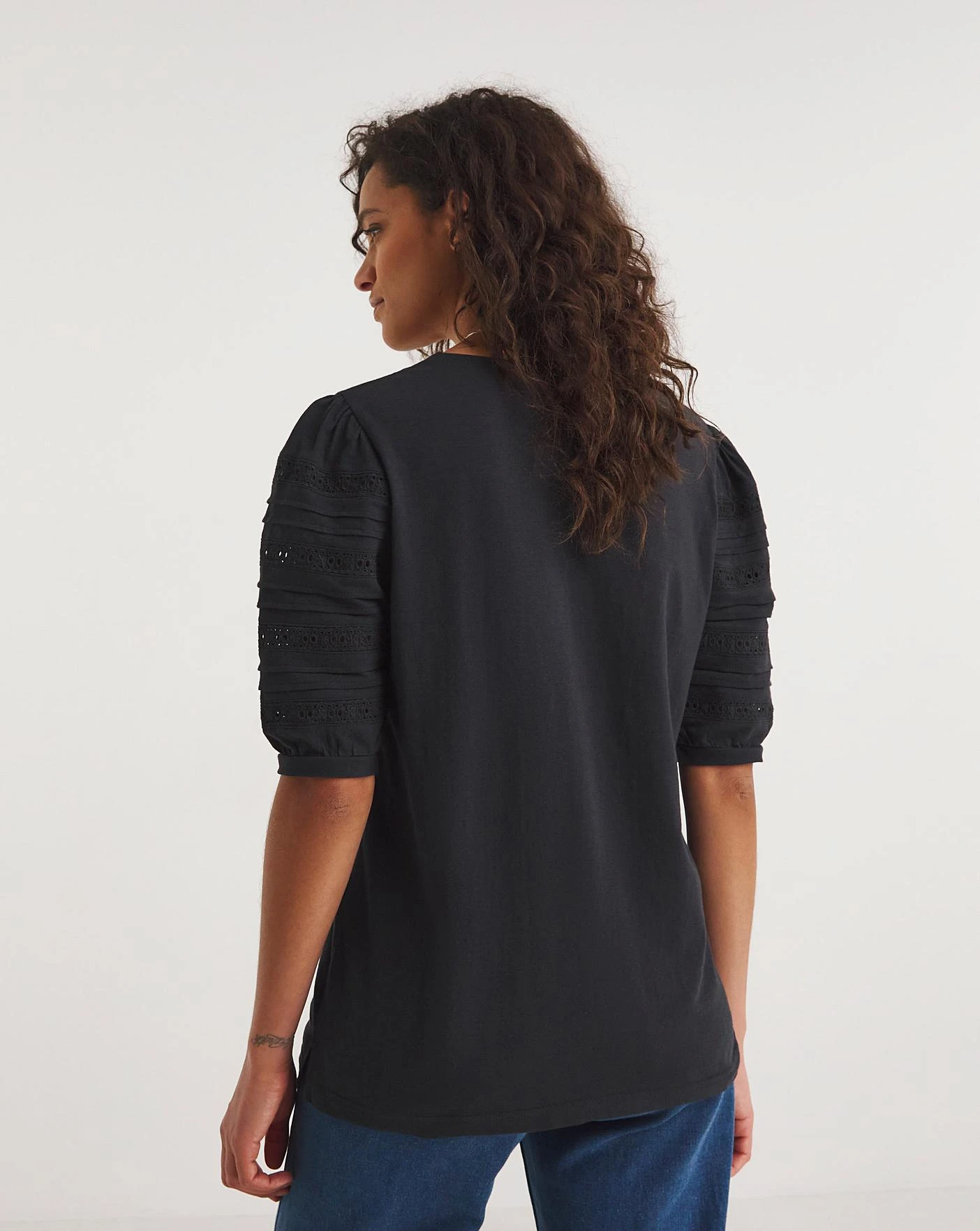 This beautiful jersey top features delicate broderie half sleeves with elasticated cuffs for comfort. A fabulous style to dress up or down, this top comes in a regular relaxed fit and is perfect to pair with denim of jeans. Find this style in another colour on our website.