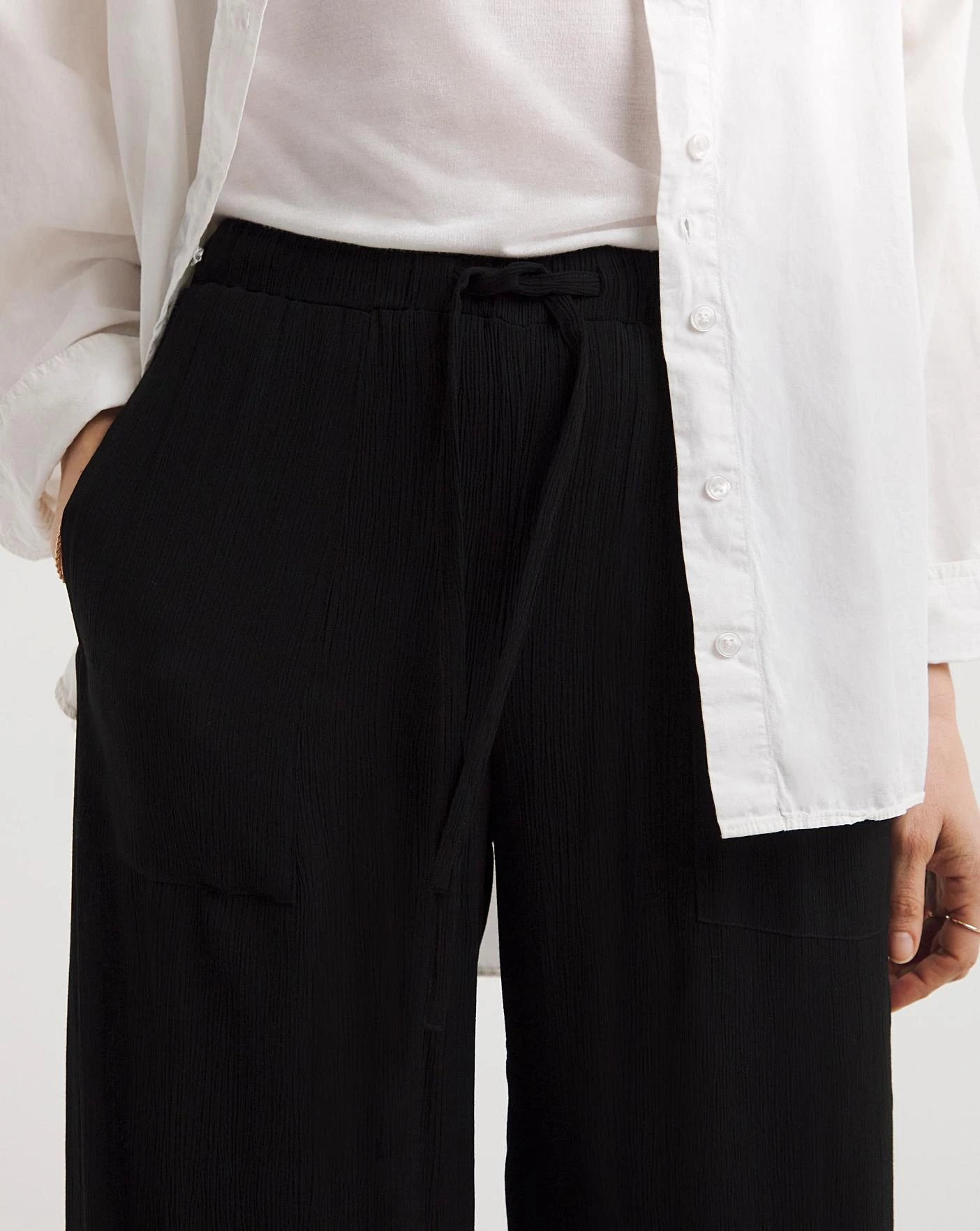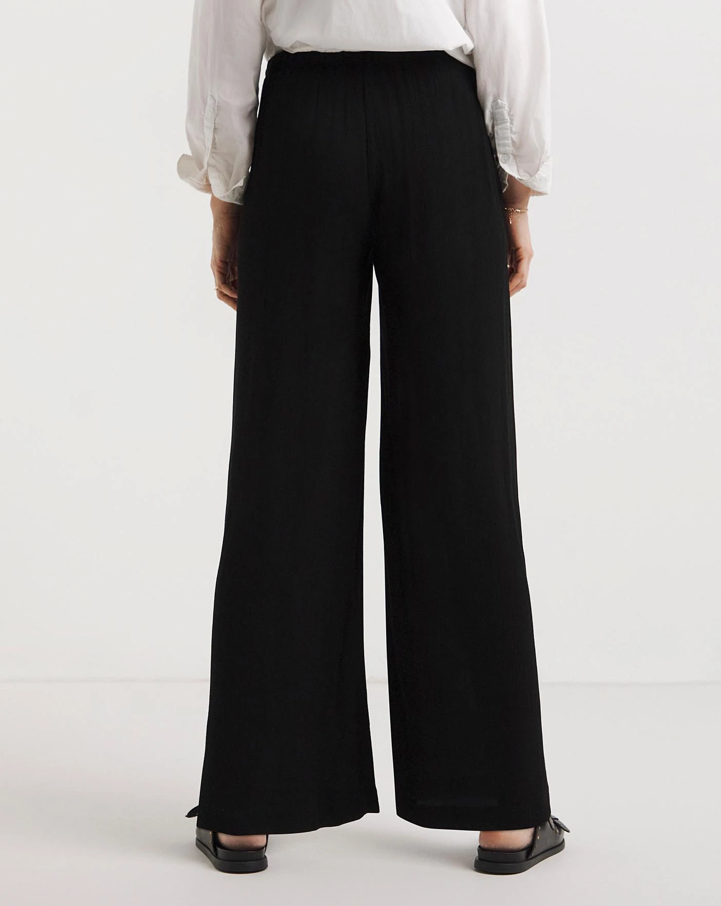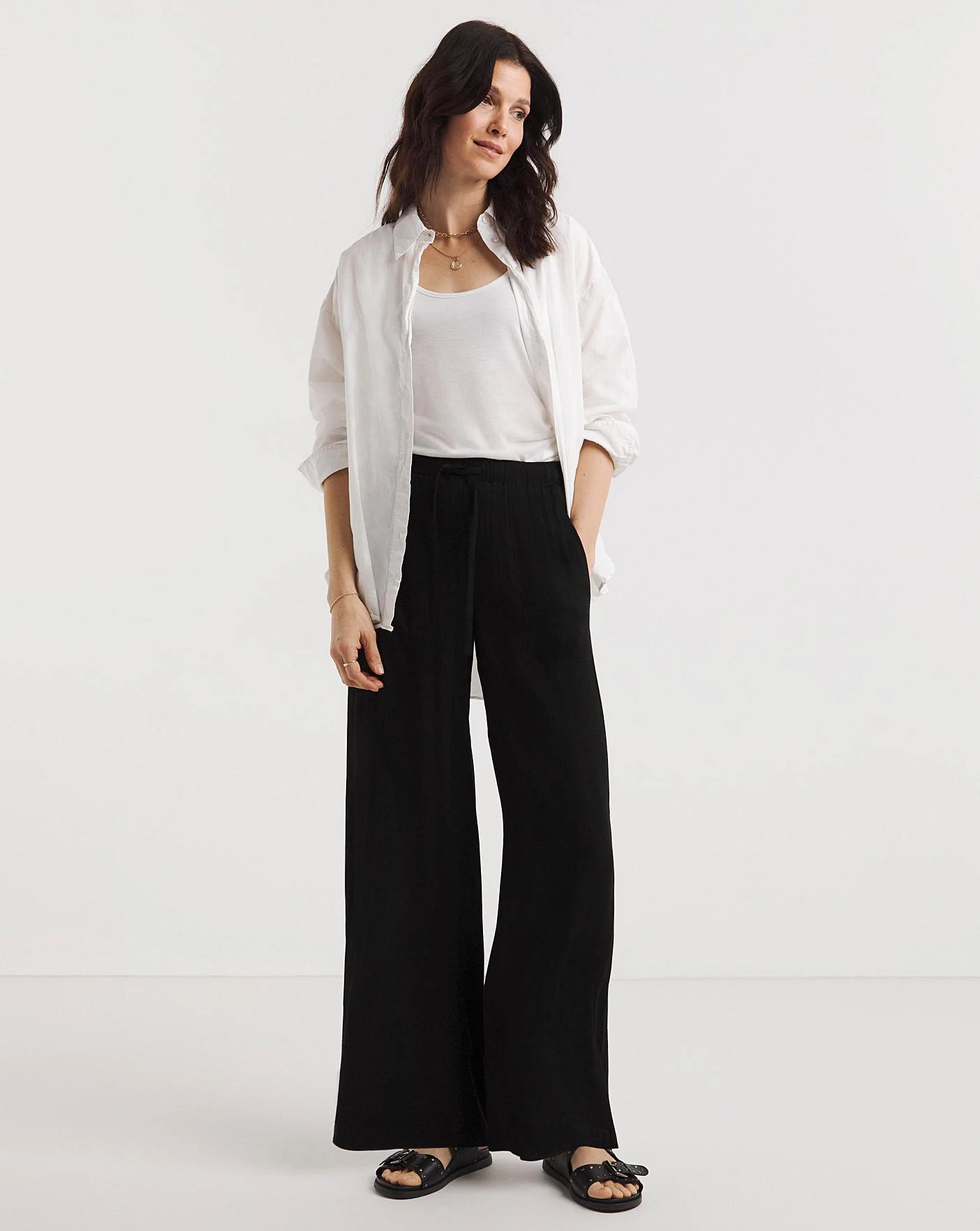 Our crinkle styles are a perfect way to update your summer wardrobe. Made from a super breathable textured polyester fabric, they are the perfect low maintenance style to take on holidays and wear as part of your summer wardrobe. This black wide leg is an absolute wardrobe staple this season, these wide leg trousers are a super comfortable pull on style but will add that extra bit of lift to your summer outfit. Pair with your favourite tee and sandals for an effortless all day summertime look.