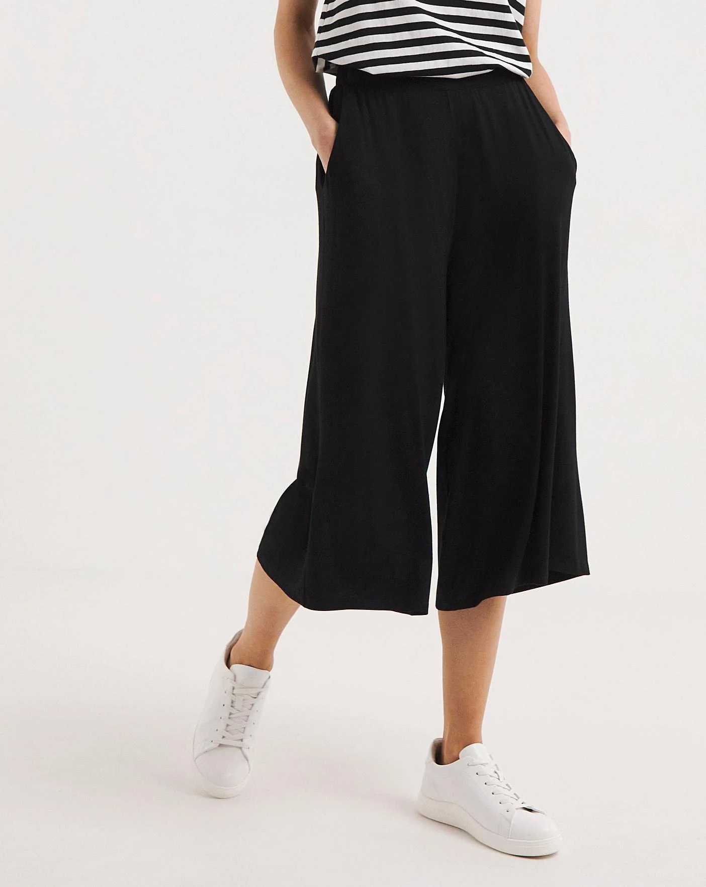 For all day comfort and style, it has got to be these jersey wide leg culottes. In a jet black jersey stretch fabric, these trousers feature a wide waistband and for super comfy all day wear and are super easy to pair back with any outfit. This style is super versatile and a true wardrobe essential.