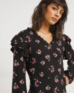 Exclusive to us – Jo by Joanna Hope. This lovely maxi dress comes in a head turning tie dye print with gold foil print detail. Featuring a v neckline with ties and frill detail to bodice and neckline. Dress comes lined and fastens with a side concealed zip.