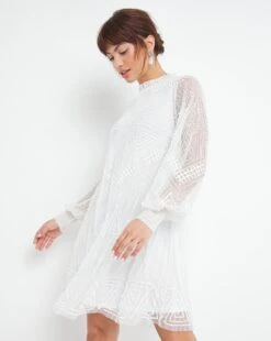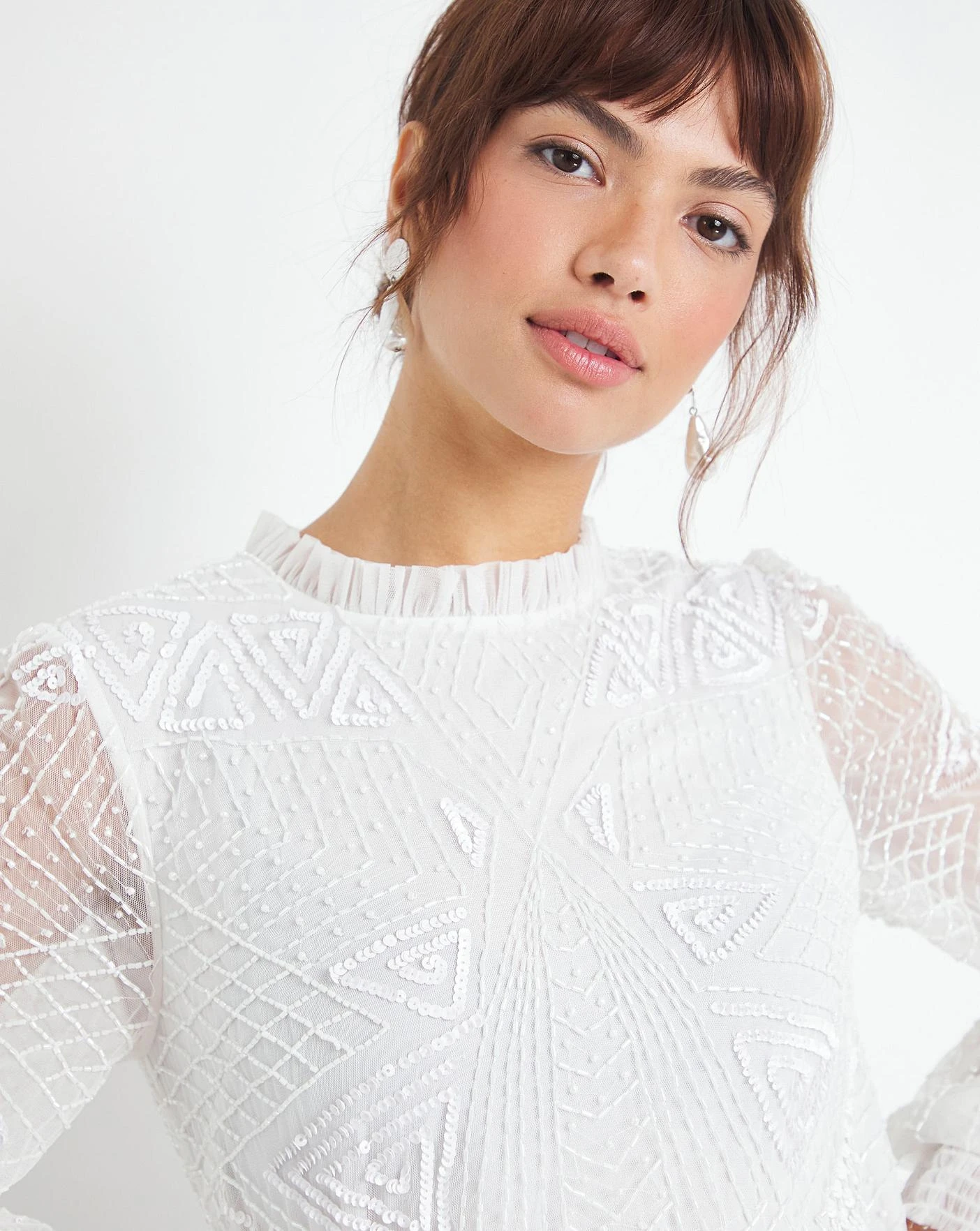 Turn heads in our Joanna Hope beaded dress, featuring mesh detailing and smocked cuffs. Dress comes body lined and fastens at the back with a keyhole, hook and eye.