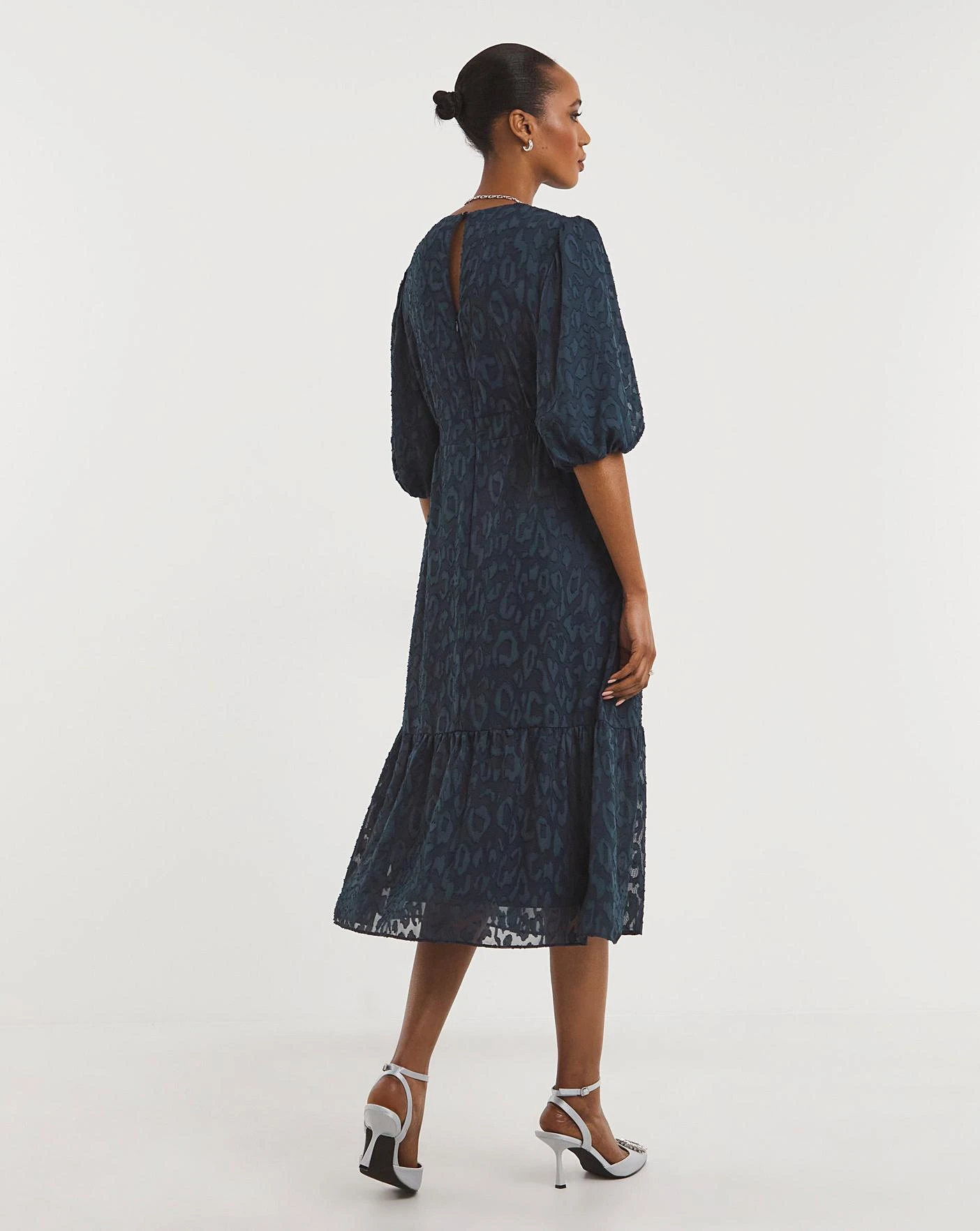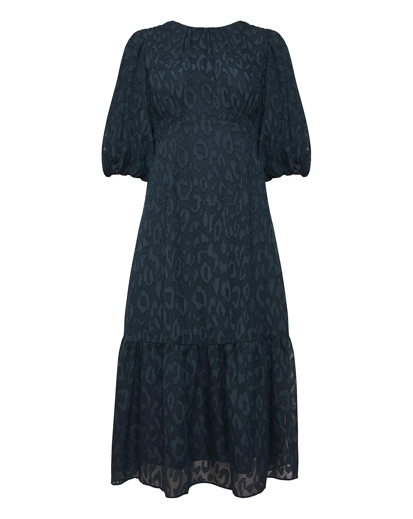 This stunning Joanna Hope midi dress features a pretty burnout design, adding a contemporary style to this classic dress. Complete with delicate bubble sleeves and cut to a true empire style to flatter the figure. On a stunning navy satin fabrication, this dress features a pretty animal print. Finished with a round neck and fully lined body.