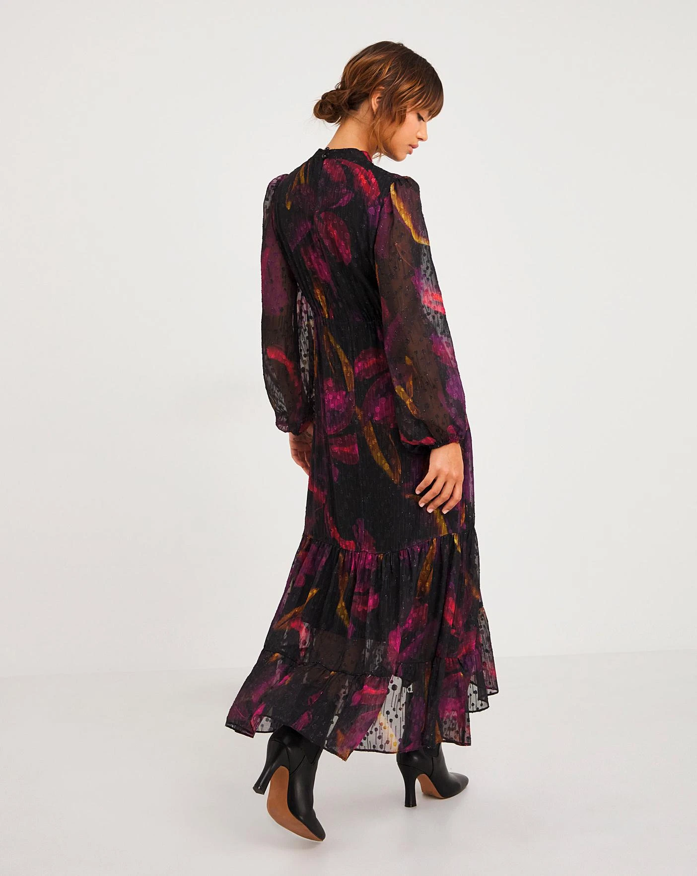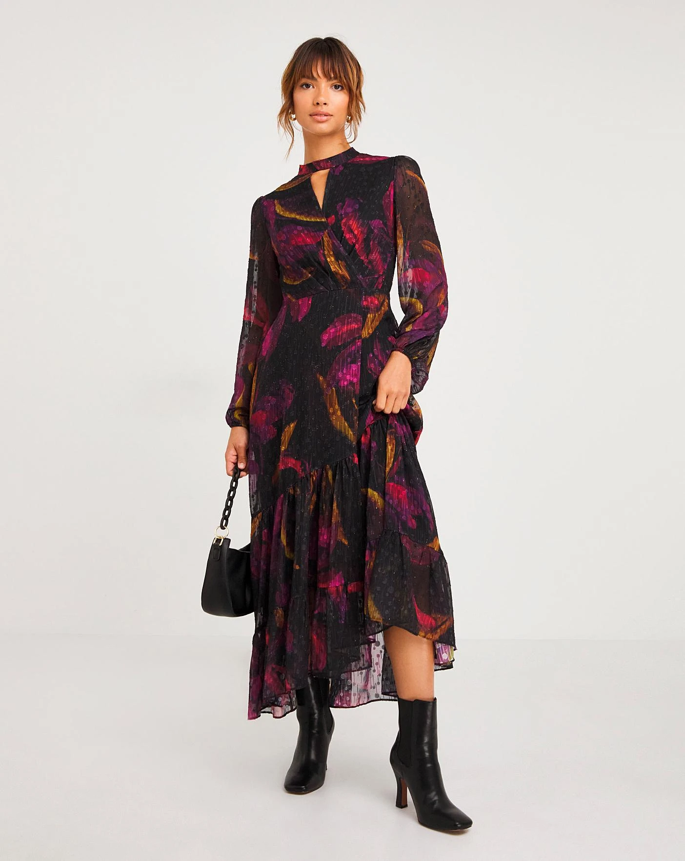 In a sultry abstract floral print on a dobby chiffon base with metallic striping, this dress is a fluid, luxurious piece. Designed with voluminous balloon sleeves with elasticated cuffs, a mock wrap feature, and a choker-style neckline creating a keyhole detail. Complete with a frill hem, this dress is modest yet feminine, perfect for summer occasion dressing. Pair with a strappy heeled sandal to complete your look.