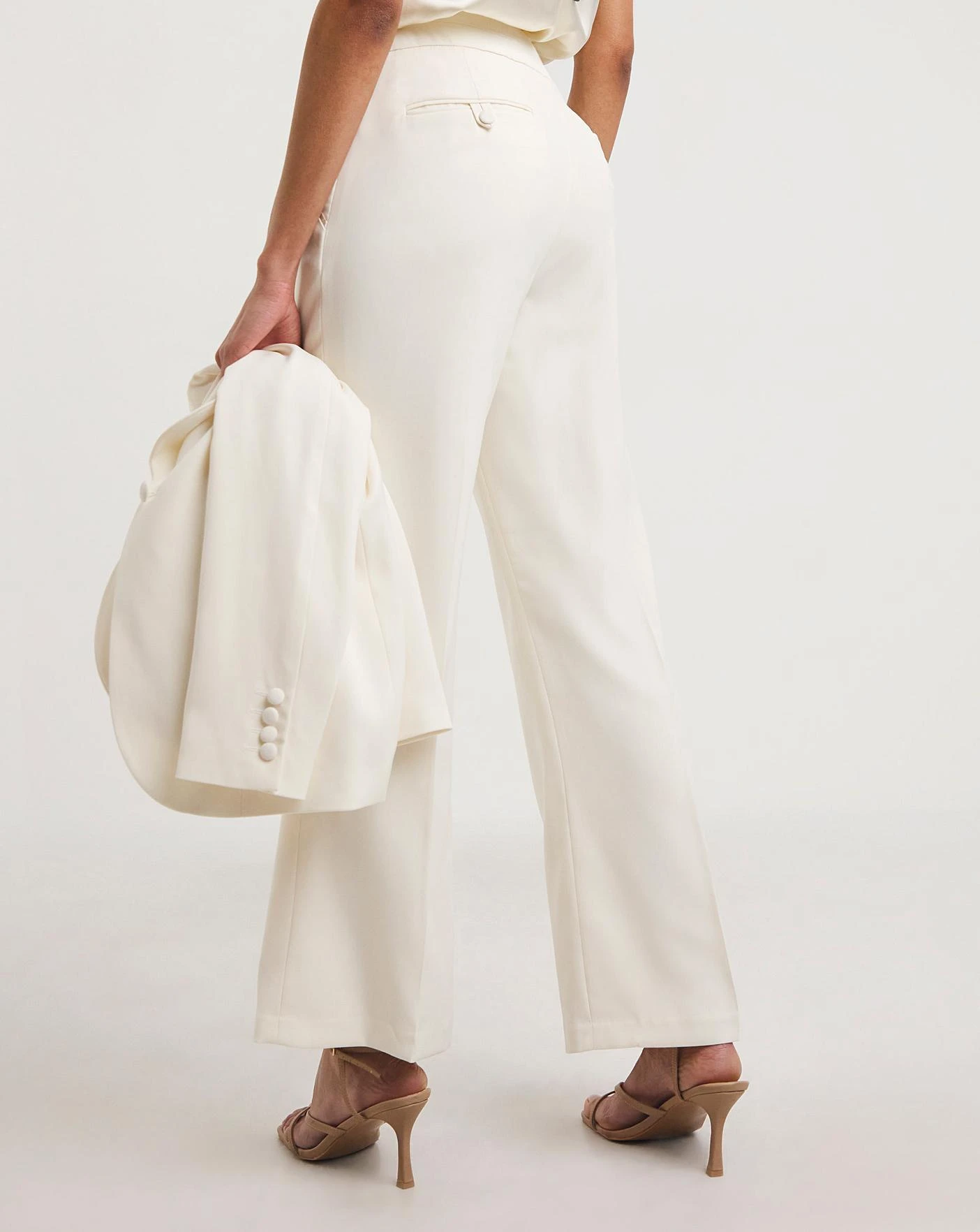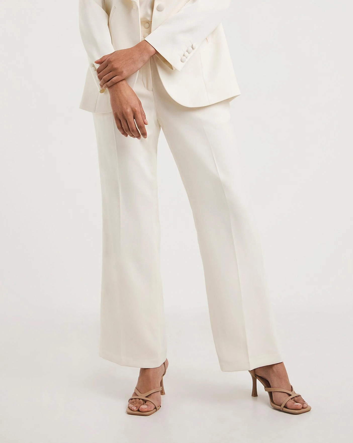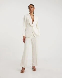 Perfect for an elegant wedding or rehearsal dinner. This sophisticated ivory, fitted bridal suit is crafted from a luxurious satin back crepe. These beautiful trousers are elegant and structured. They feature a button front, and back pockets, with a stunning flare leg shape. . A modern statement on classic look.