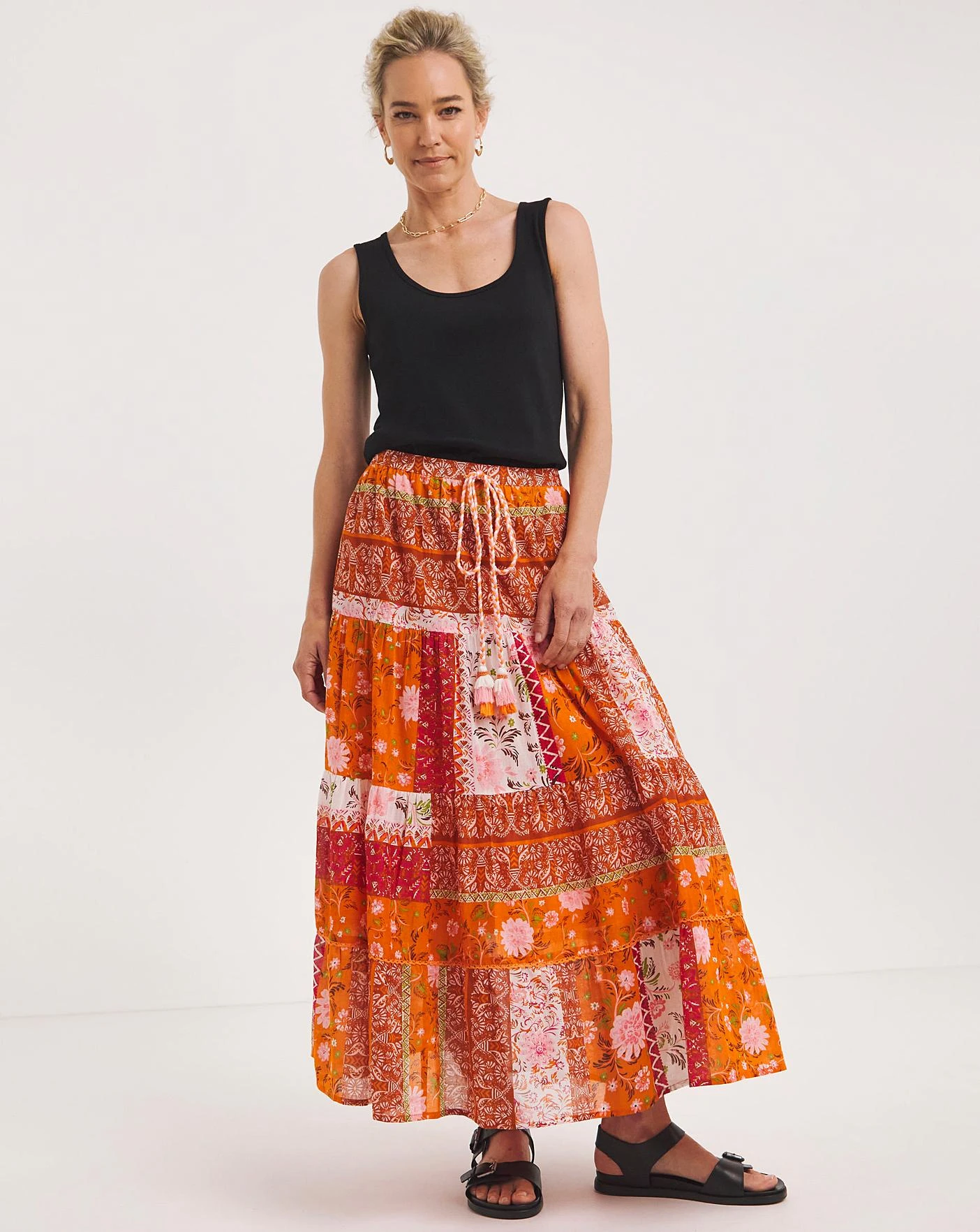 Are you looking for a fun, flowing patchwork skirt for summer? Our women’s tiered maxi skirt has bold, vibrant colours to really embody the season. Topped off with a unique, braided tie, it will fit fabulously and be super flattering with its tiered design and elasticated waistband. Just pair it with boots and a t-shirt to create a real statement style.