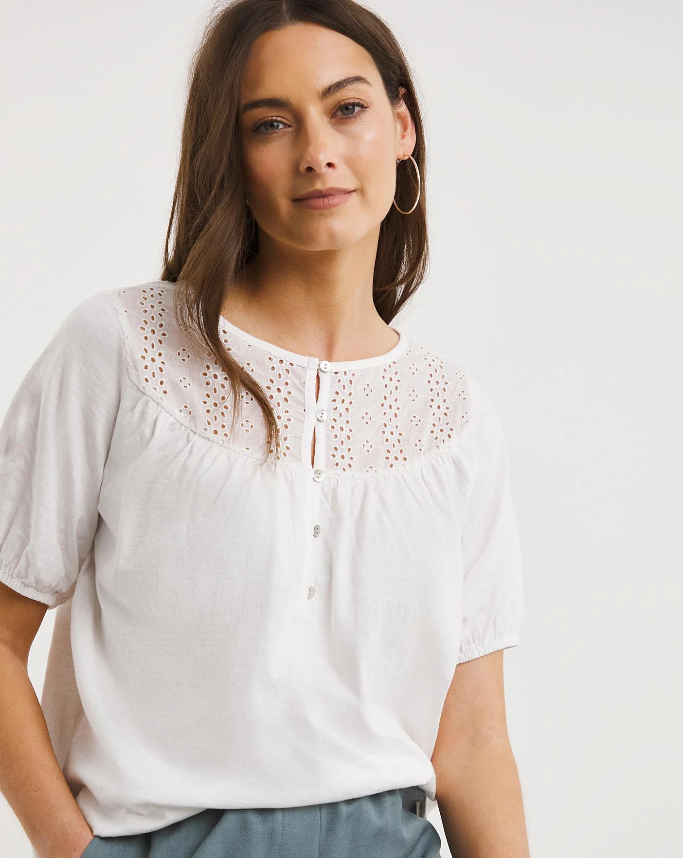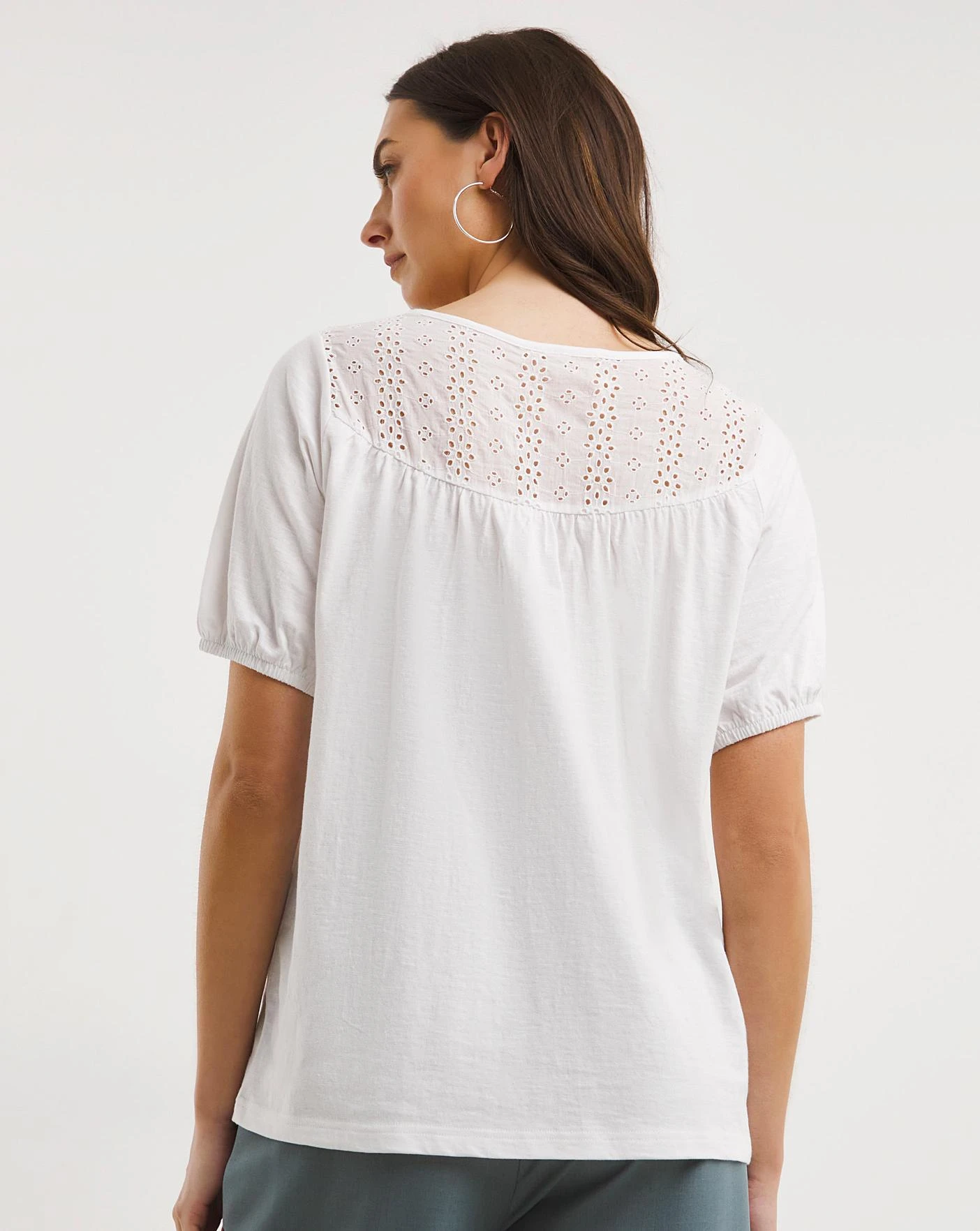 This classic jersey blouse features a button through front, elasticated cuff detail and a round neck with a pretty woven lace trim. Pair with jeans for a stylish, feminine look. Made from 100% BCI cotton. By choosing our cotton products, you’re supporting Julipa’s investment in Better Cotton’s mission. This product is sourced via a system of mass balance and therefore may not contain Better Cotton.