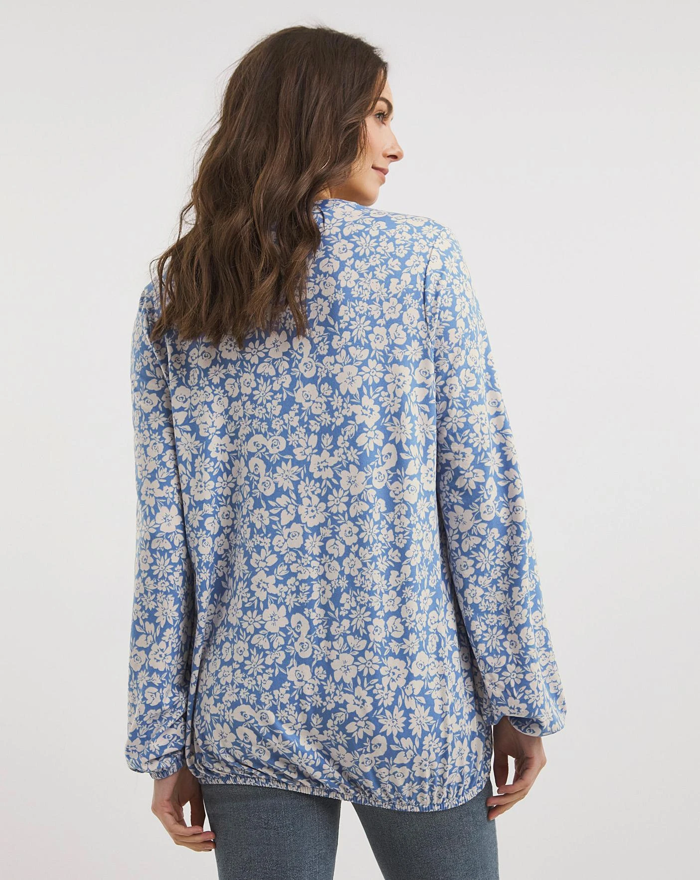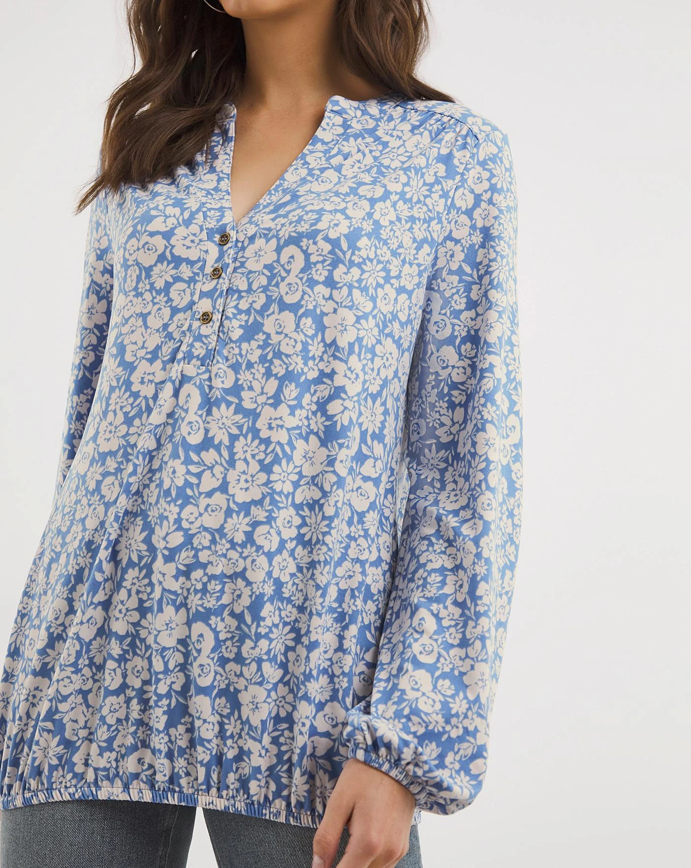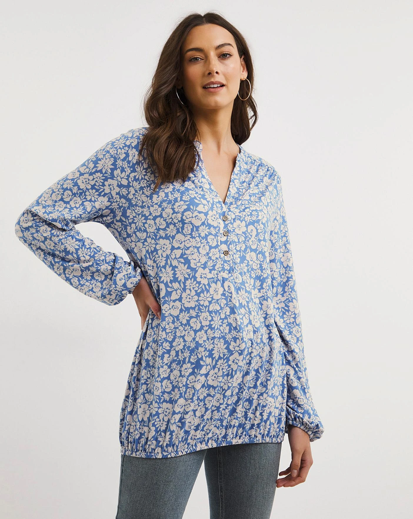 This soft jersey top features a subtle elasticated bubble hem, elasticated cuff detail and a flattering V-Neck with a button placket. Pair with jeans for a stylish casual look. Made from a sustainable viscose fabric.