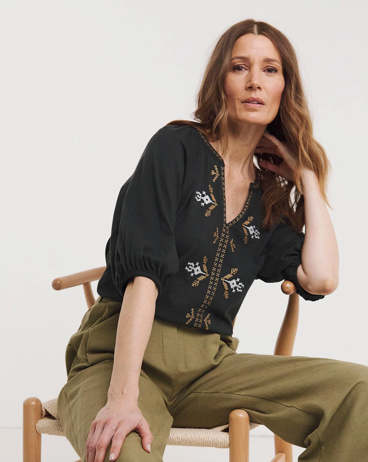This contrast embroidered notch neck top is the perfect throw on piece. Featuring short sleeves and made from BCI cotton.