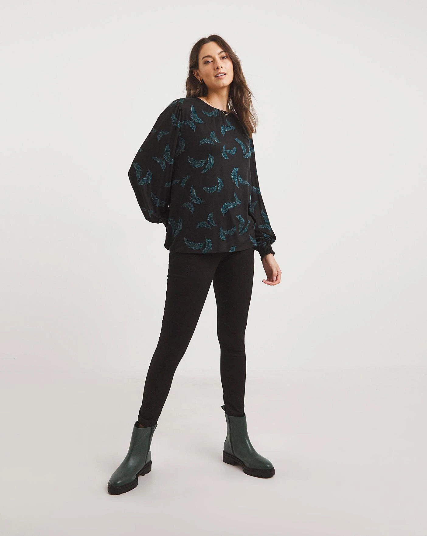 This long sleeve top is designed in a jersey stretch fabric is finished with a roundneck line with subtle gathering. A wardrbe staple that is perfect for transitional layering