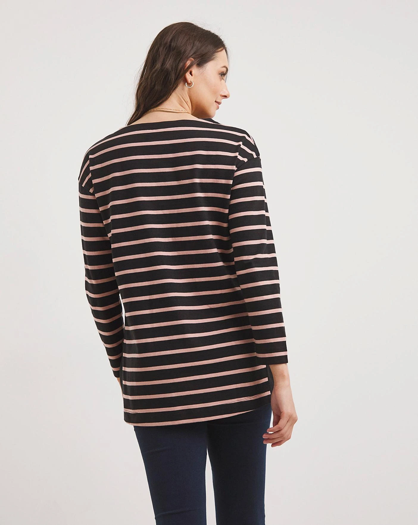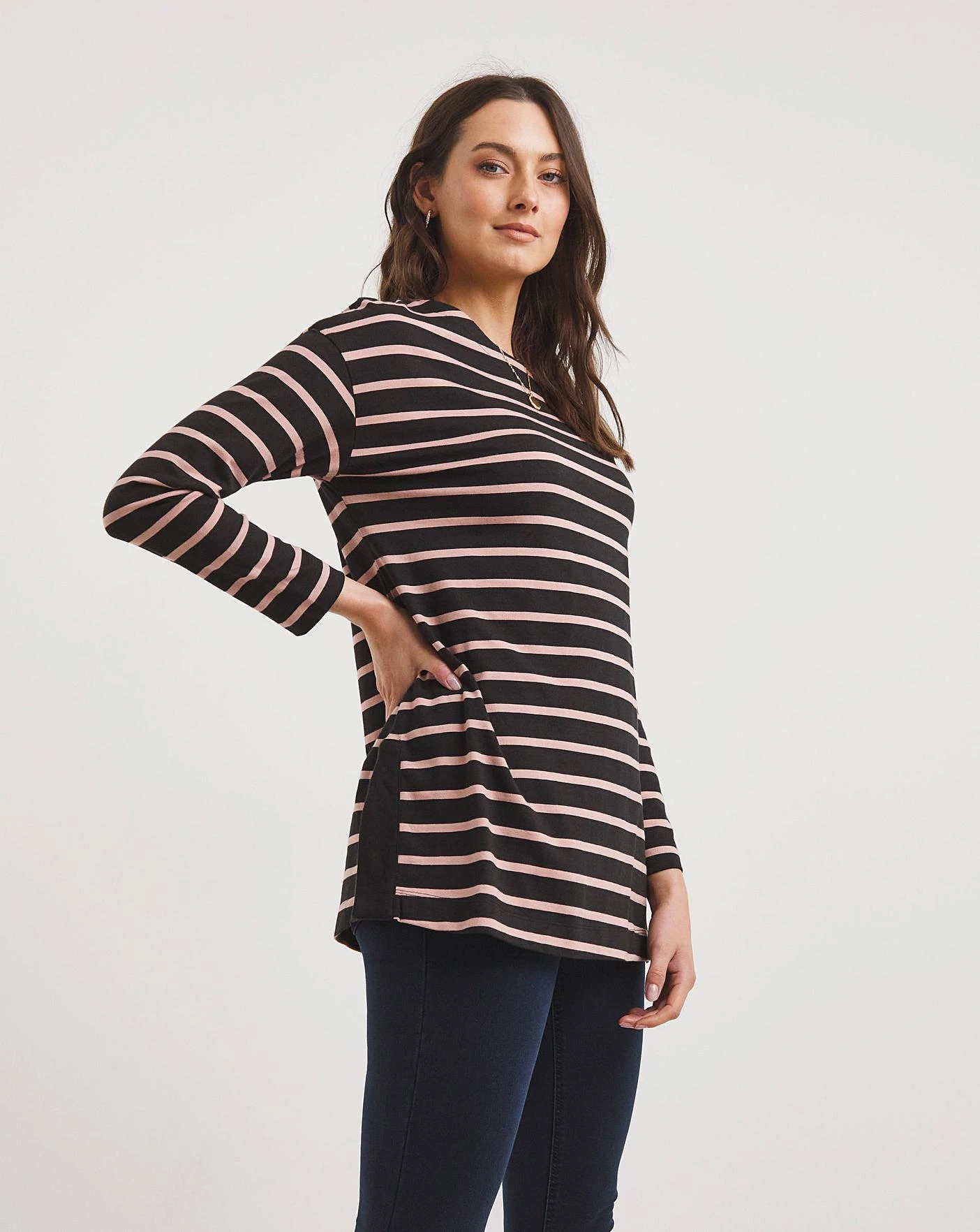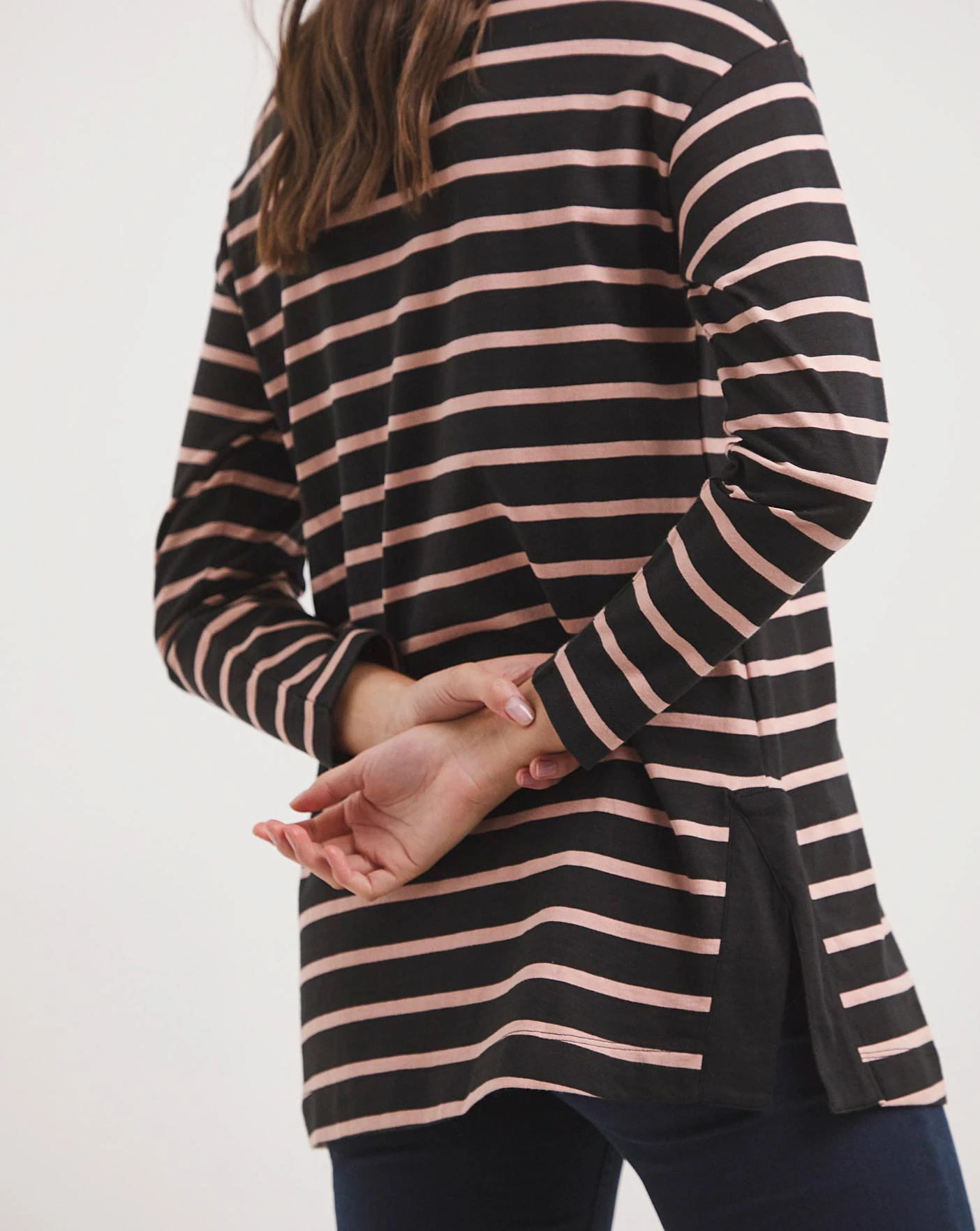 Designed in a relaxed silhouette with a round neckline, split side hem with contrast binding and long sleeves, this striped t-shirt is one of our go-to pieces for an easy day look. Pair yours with jeans.
