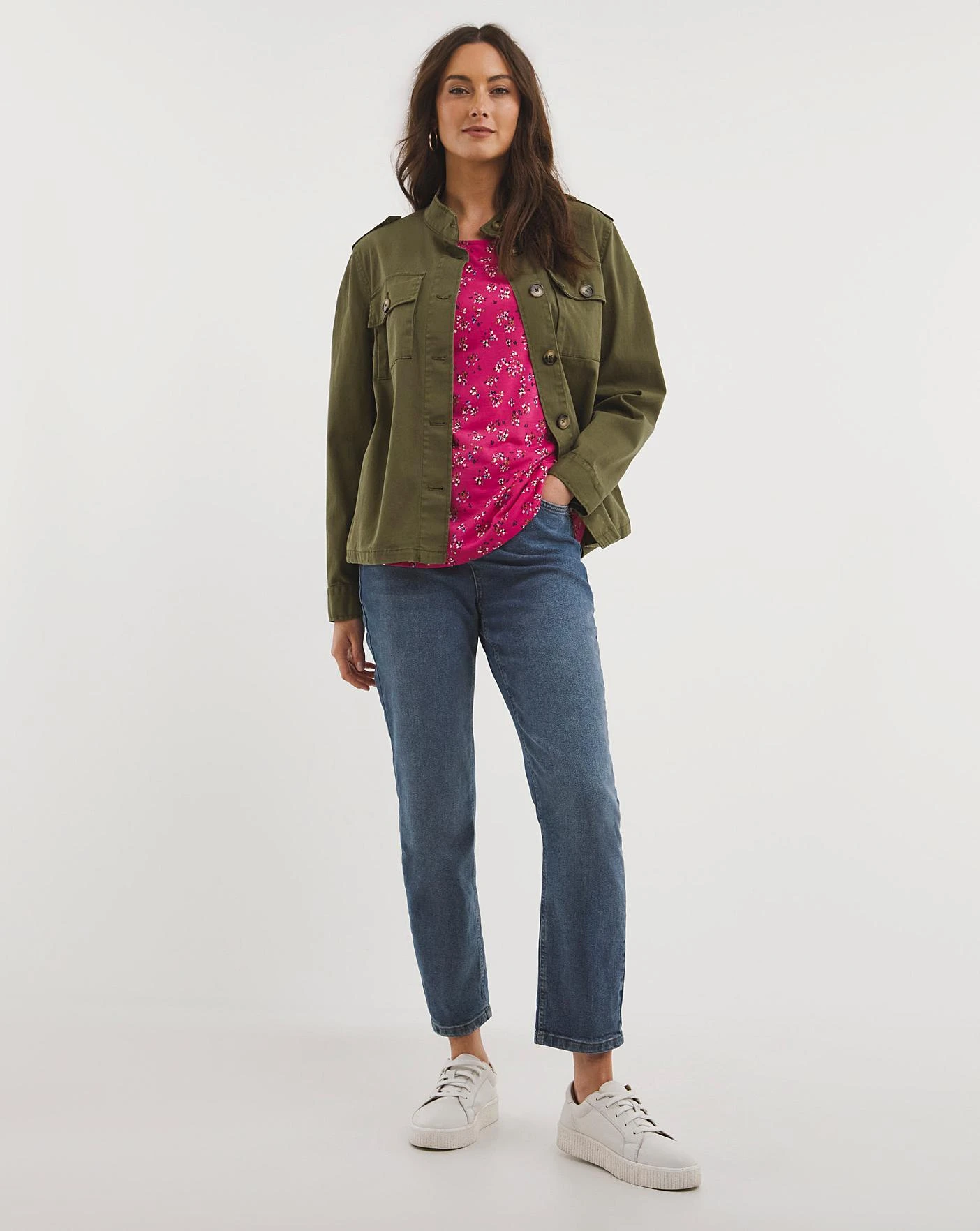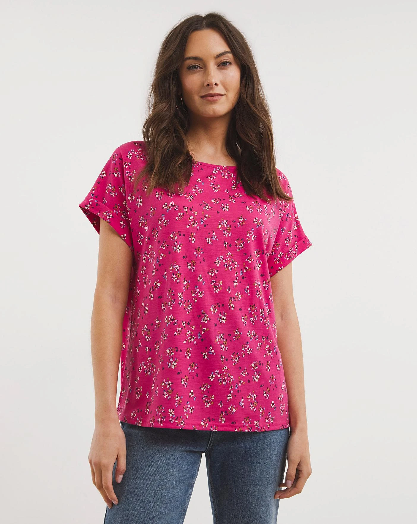 This jersey t-shirt features a flattering round neck with turn back cuffs in a stylish print.