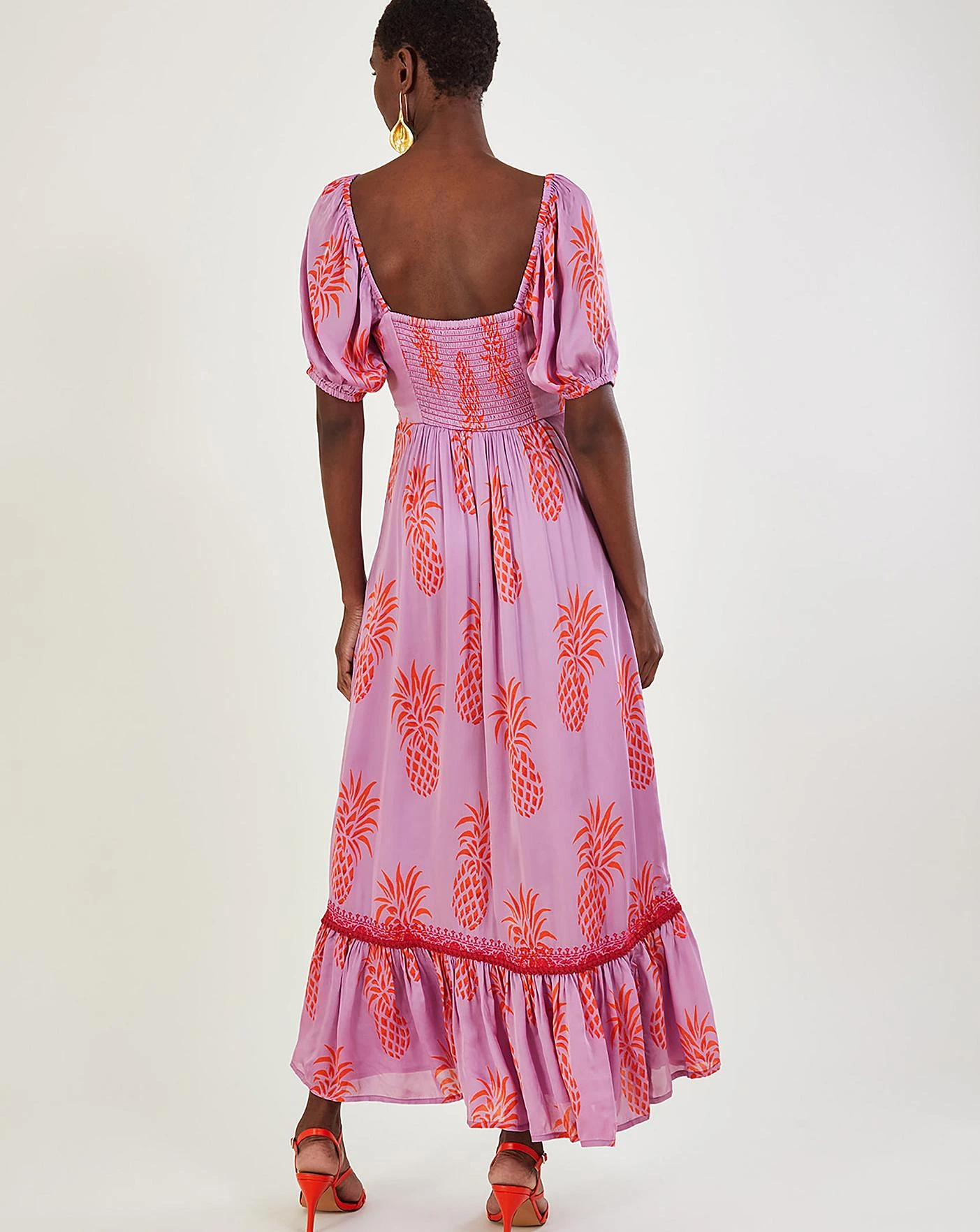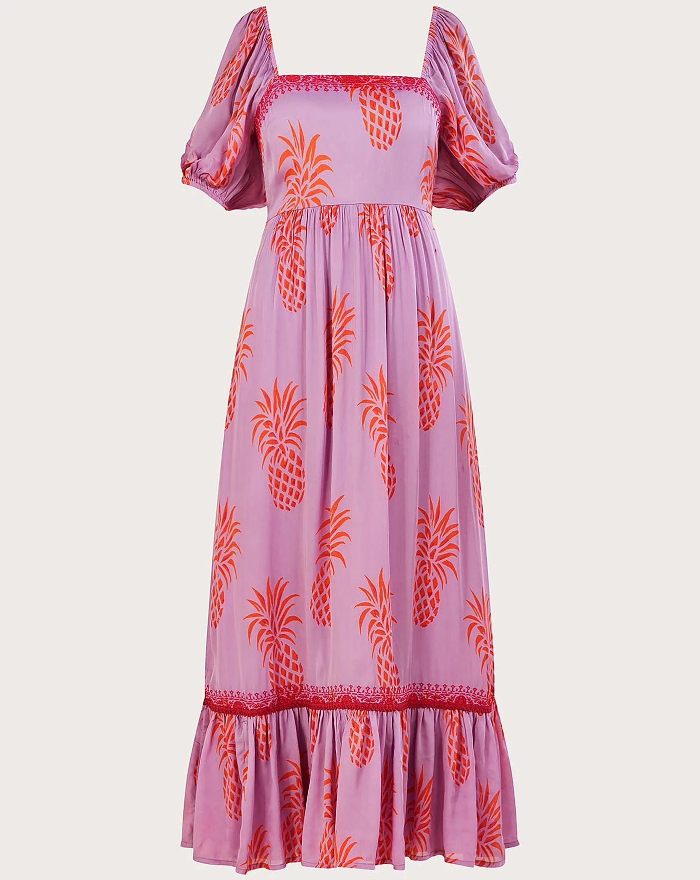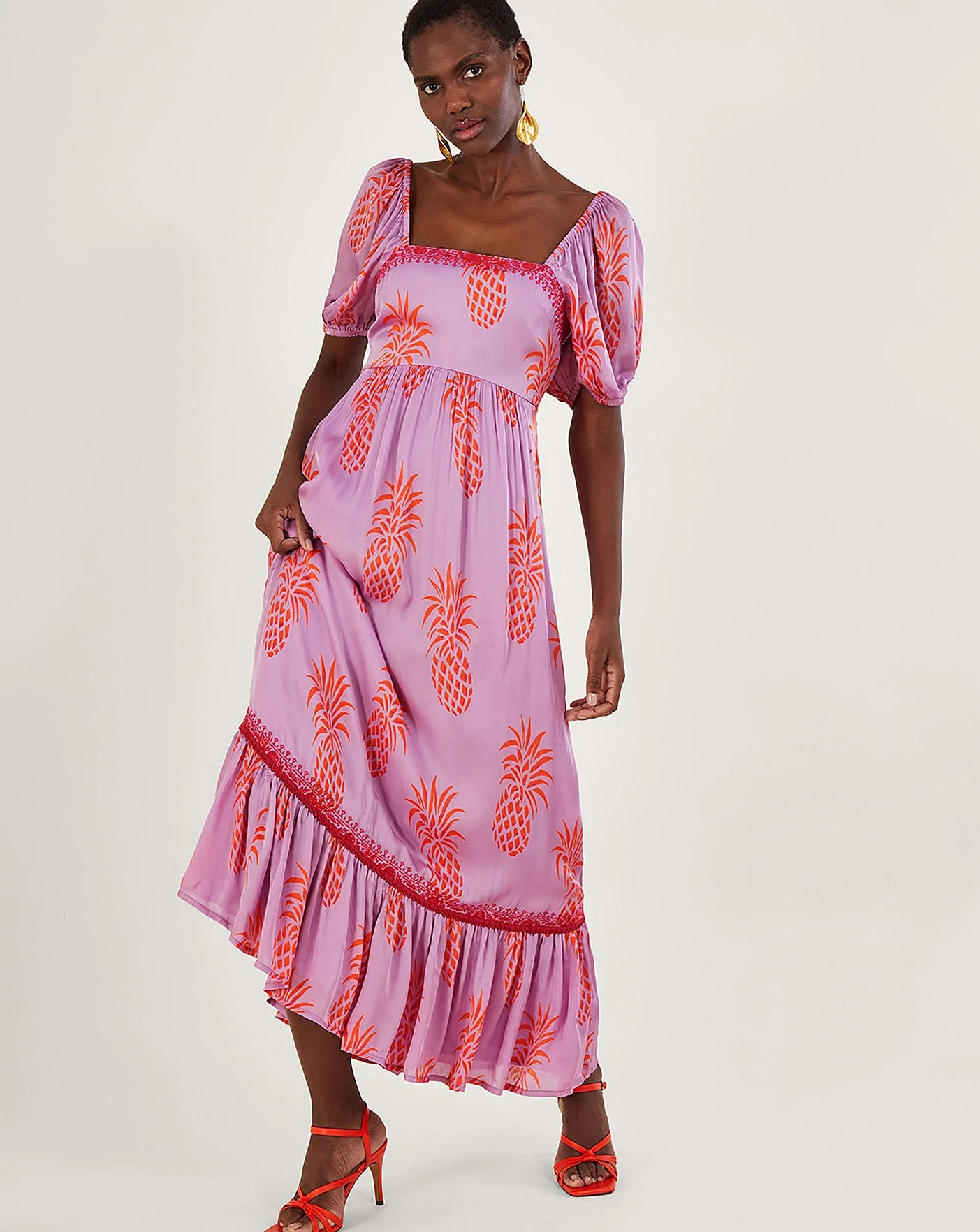 - Anasi’s eye-catching print is hard to miss, in the best way. Showcasing juicy red pineapples over a lilac backdrop, look closely to see how the embroidery defines the neckline and tiered hem. Engineered in glossy satin, accessorise the puff sleeves and square neck with a twinkly pendant necklace. As part of the journey to make our clothes kinder to the world around us, this item was made using more sustainable raw materials, such as organic cotton, recycled polyester and viscose from responsibly grown forests.