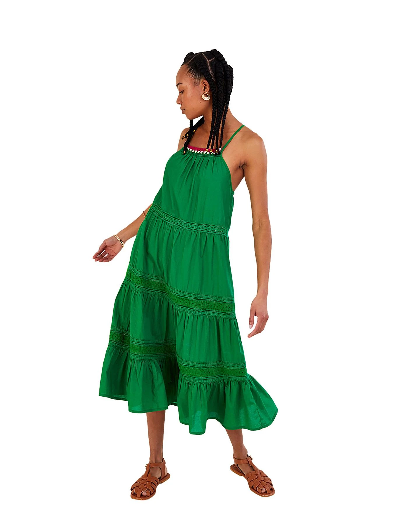- Cast in a vibrant grassy green, this dress is spun in soft cotton that’ll keep you cool from beach days, to morning coffees in the garden. The square neckline boasts contrast embroidery, cinching in at the waist and tiering through the skirt with broderie detailing for a bohemian finish. Simply pair this piece with your comfiest cork bed sandals for an easy breezy summer finish. As part of the journey to make our clothes kinder to the world around us, this item was made using more sustainable raw materials, such as organic cotton, recycled polyester and viscose from responsibly grown forests.