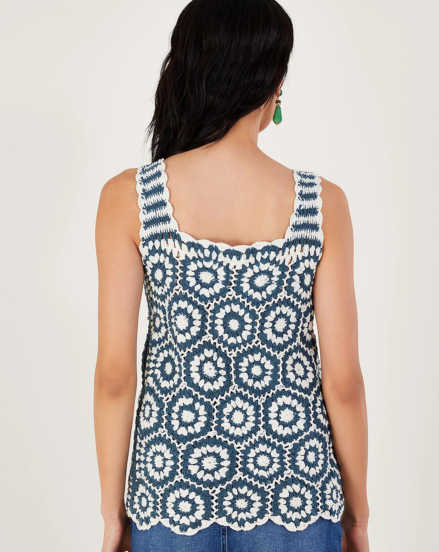 - Keeping the crochet trend throughout the seasons, this crochet patchwork tank top combines sunny yellow and fuchsia hues to create a piece that’ll brighten any outfit. Its relaxed silhouette is accompanied with a square neckline and wide shoulder straps. Designed in breathable crochet.As part of the journey to make our clothes kinder to the world around us, this item was made using more sustainable raw materials, such as organic cotton, recycled polyester and viscose from responsibly grown forests.