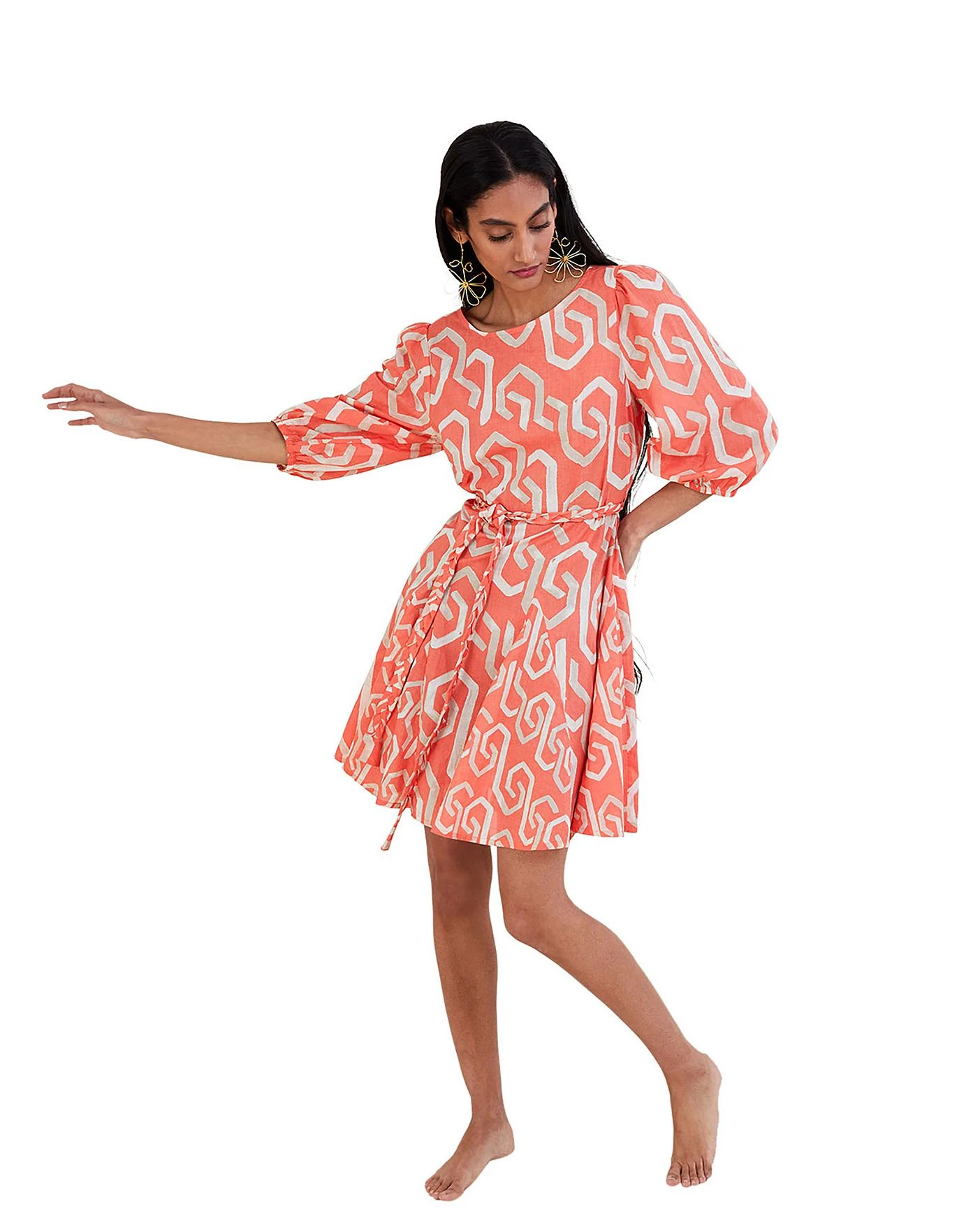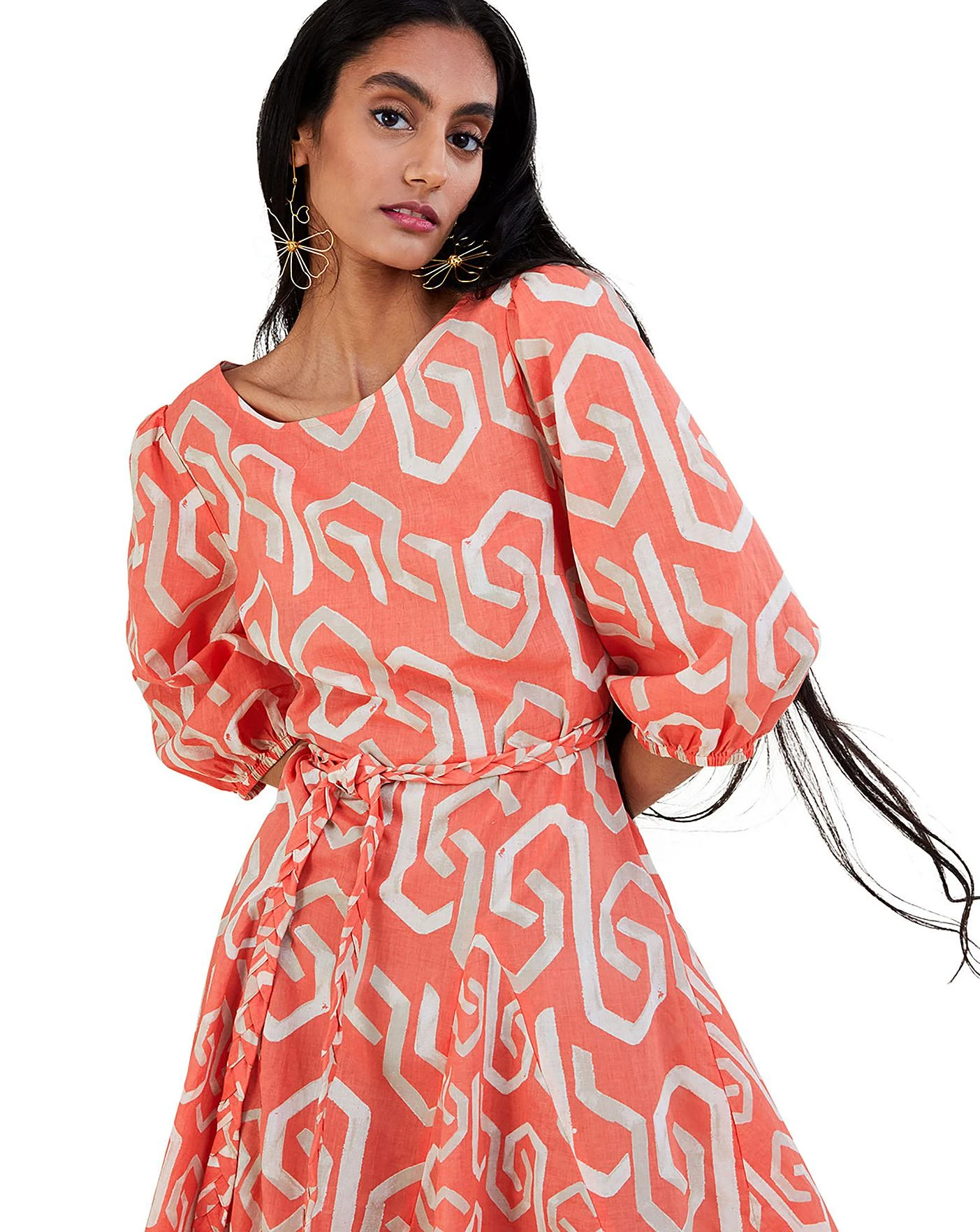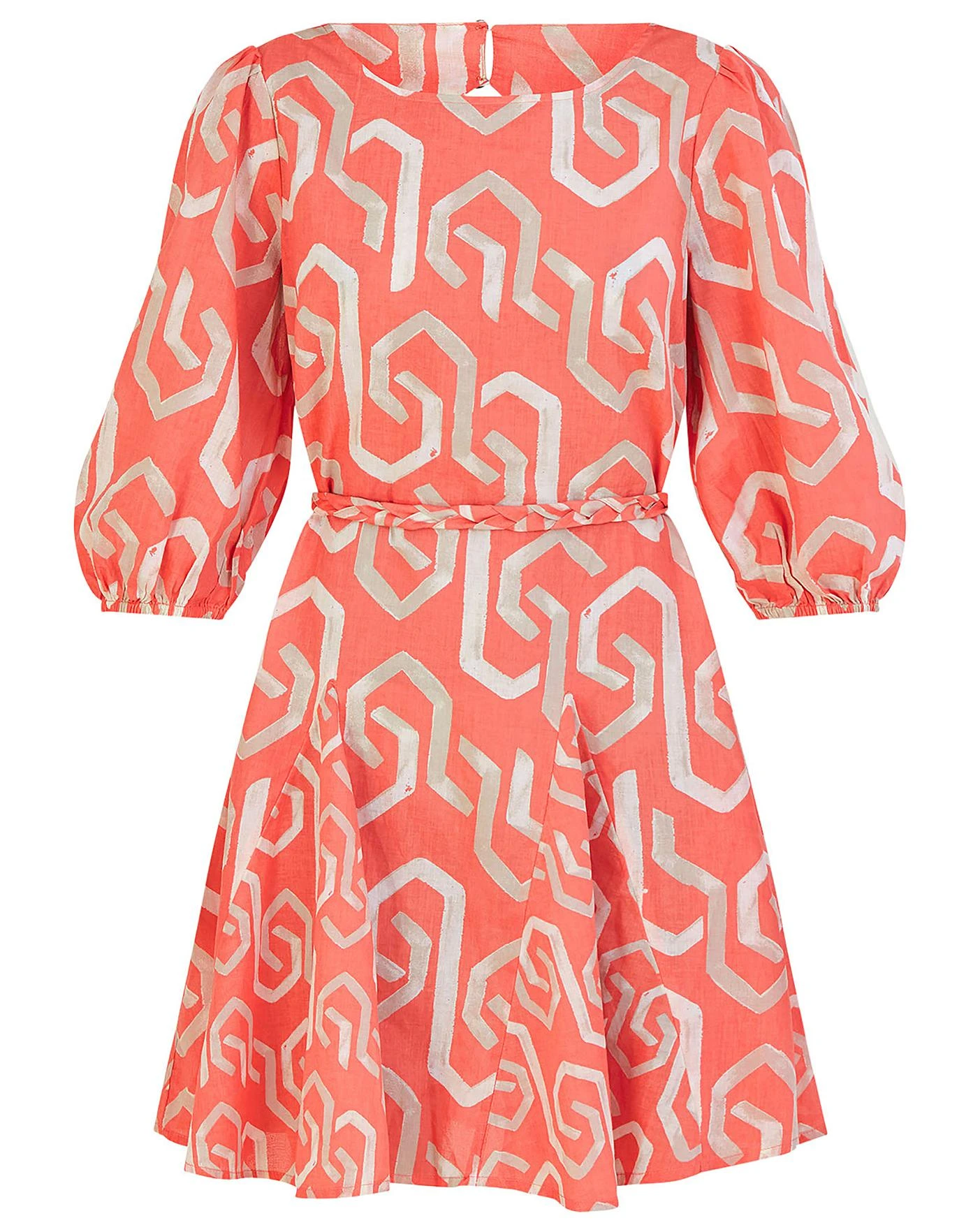 - Geometric shapes flush through the coral backdrop of this dress, creating a refreshing addition to your dress edit. Hemming at a short length, the profile sits defined at the waist with a braided tie, alongside a boat neckline and pleated skirt to complete the look. After the big reveal? Spin it to it’s back to see the pretty cut-out detail and smart button fastening. Just one of our steps towards a future for sustainable fashion, we introduce S.E.W: our commitment to using more eco-conscious materials in our ranges. This capsule collection is created using fabrics that are both kinder to the planet and have a reduced environmental impact. You’ll see blends of organic and better-sourced cotton, viscose from more responsibly grown forests and recycled polyesters made from post-consumer waste.