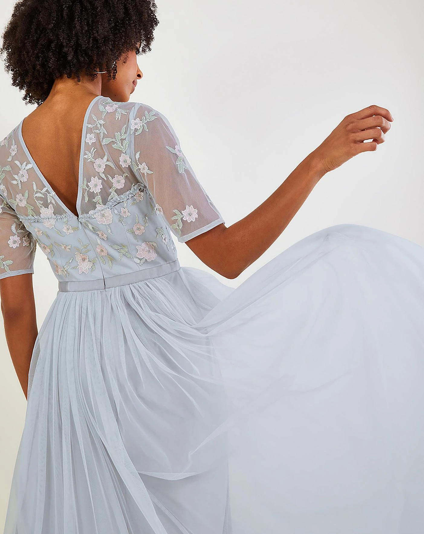 - Enchanting is an understatement when describing Harri’s floral embroidery, displaying subtle pops of pale pink and sage green over the dusky mesh backdrop. Fully lined, the delicate profile includes short sleeves and a slim bodice, whilst the waist sits defined before falling into a floaty maxi skirt. Fastens on the reverse with a zip.Just one of our steps towards a future for sustainable fashion, we introduce S.E.W: our commitment to using more eco-conscious materials in our ranges. This capsule collection is created using fabrics that are both kinder to the planet and have a reduced environmental impact. You’ll see blends of organic and better-sourced cotton, viscose from more responsibly grown forests and recycled polyesters made from post-consumer waste.