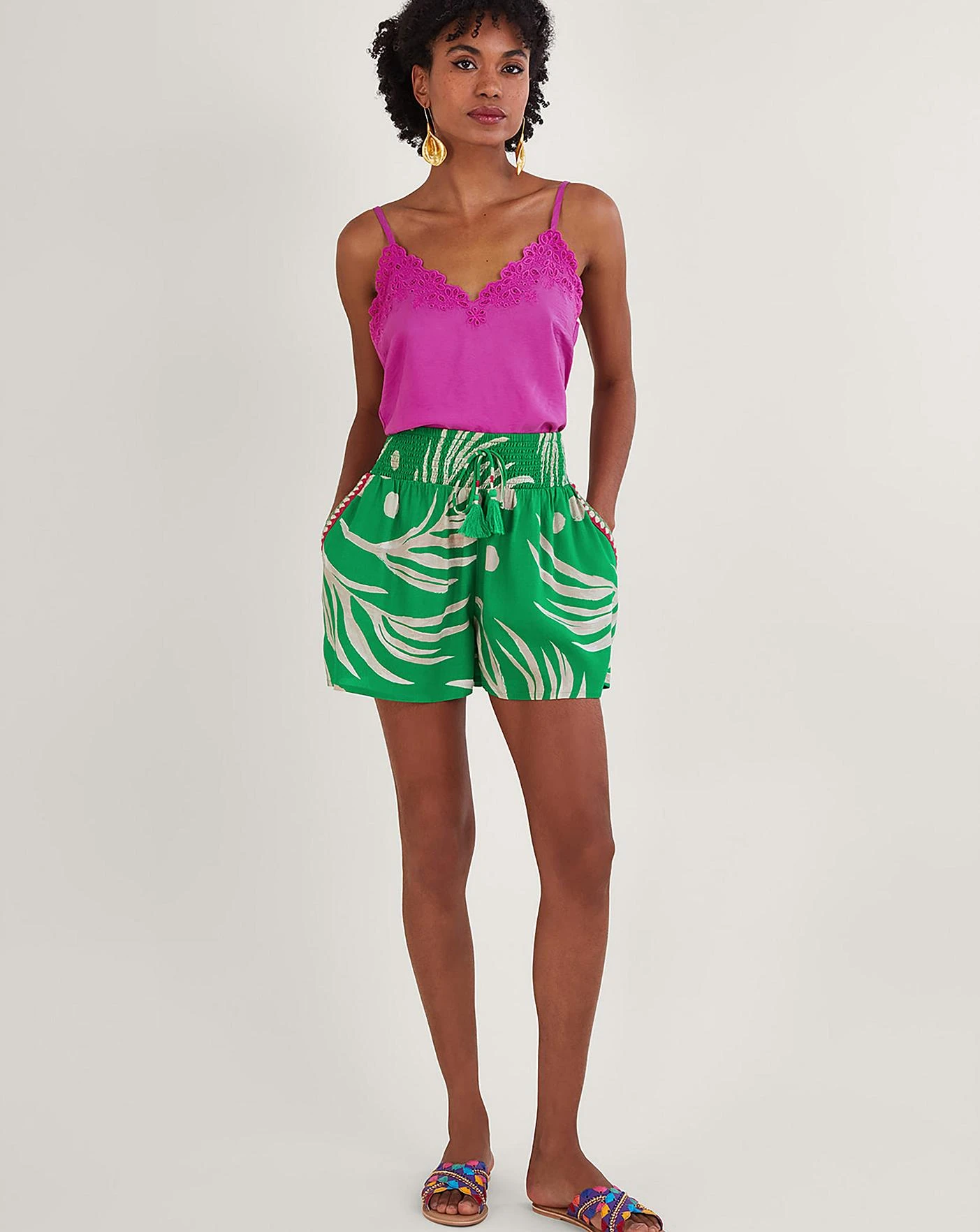 - Get in the spirit of summer when you slip into these shorts on your first morning under the holiday sun. Designed in airy LENZING ECOVERO viscose, it features a bold palm print whilst accented with crochet to the side pockets. They have the most comfortable silhouette, with a stretchy shirred waist and loose shorts, finished with a tie detail. LENZING ECOVERO is a sustainable fabric derived from certified renewable wood sources and made using eco-responsible production methods. It generates up to 50% lower emissions and water impact than traditional viscose, contributing to a cleaner environment. As part of the journey to make our clothes kinder to the world around us, this item was made using more sustainable raw materials, such as organic cotton, recycled polyester and viscose from responsibly grown forests.