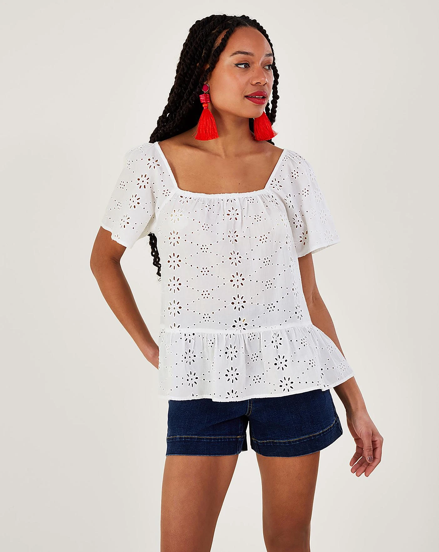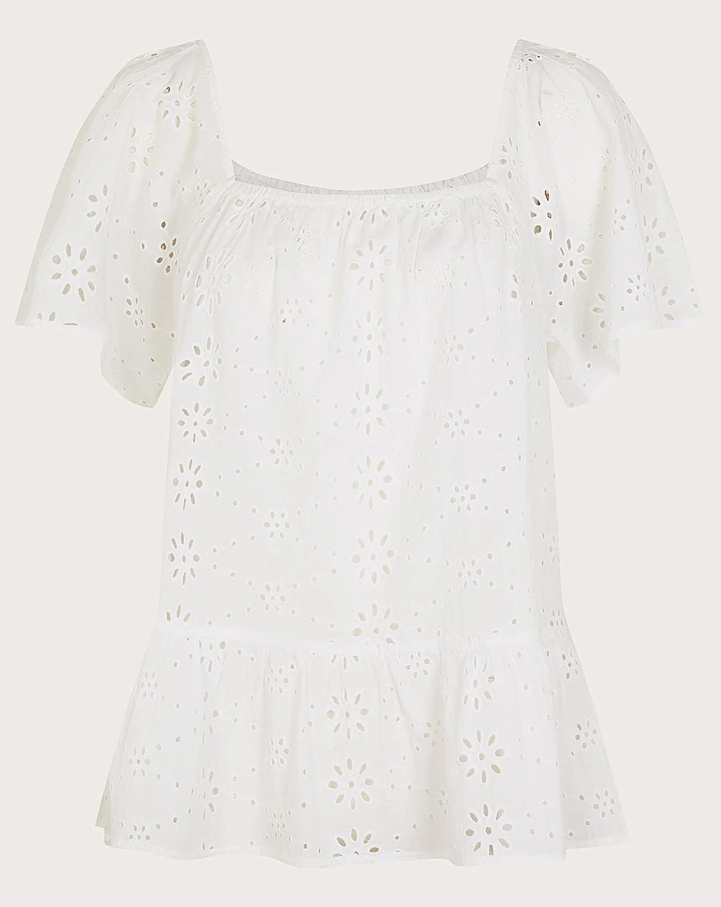 - Temperature rise? Keep it easy and breezy with this top. It features a sweet square neckline with a tiered hem, finished with schiffli embroidery. Style it with your comfiest shorts for a pretty and practical barbecue look.As part of the journey to make our clothes kinder to the world around us, this item was made using more sustainable raw materials, such as organic cotton, recycled polyester and viscose from responsibly grown forests.