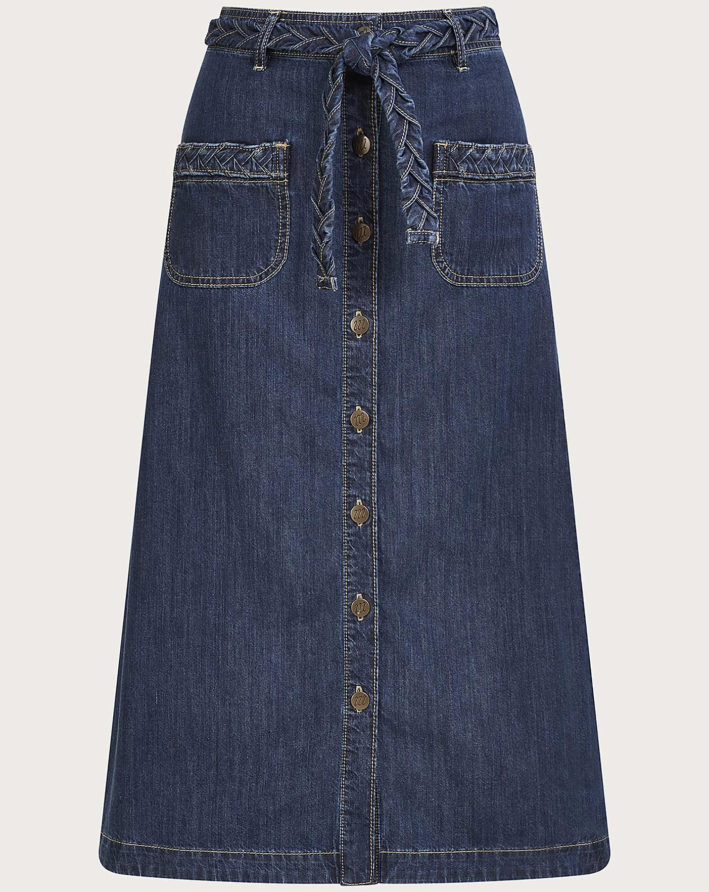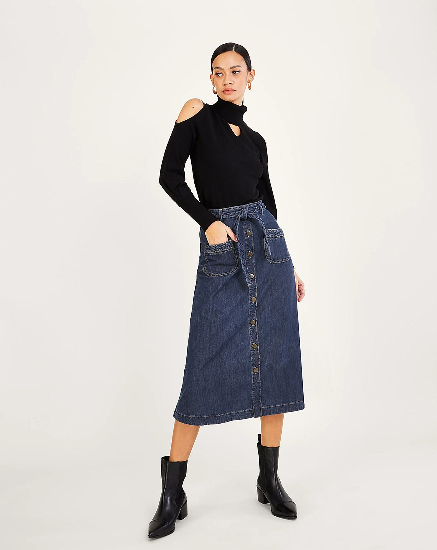 Monsoon Plait Pocket Denim Midi Skirt| Denim Blue