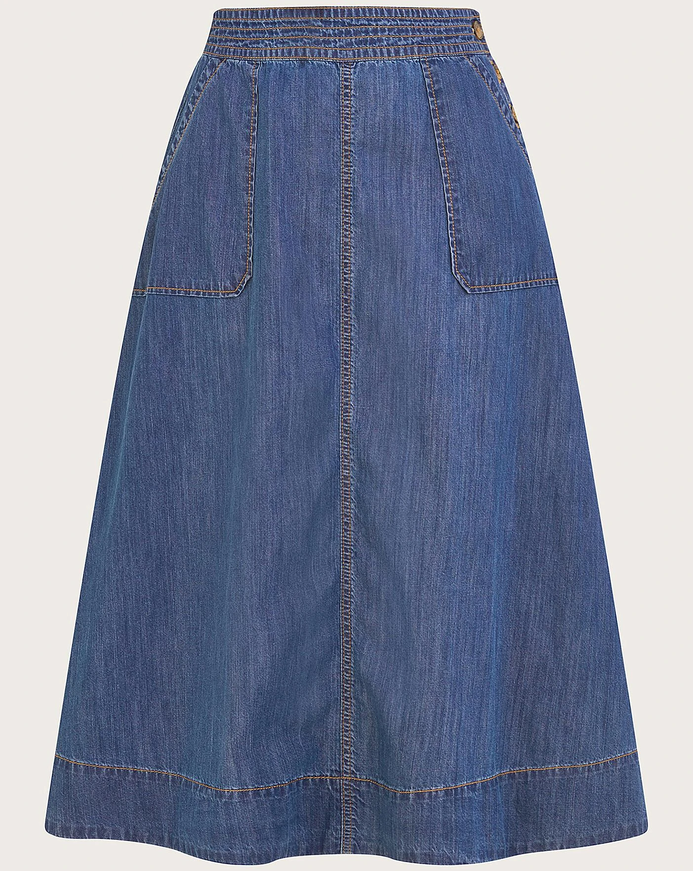 - Spun to feel lightweight, her light denim wash and midi length will see you through the springtime and into breezy beer gardens in autumn. The shirred-look waist and A-line skirt shapes your silhouette beautifully, simply tuck in a floral blouse and you’re good to go. As part of the journey to make our clothes kinder to the world around us, this item was made using more sustainable raw materials, such as organic cotton, recycled polyester and viscose from responsibly grown forests.