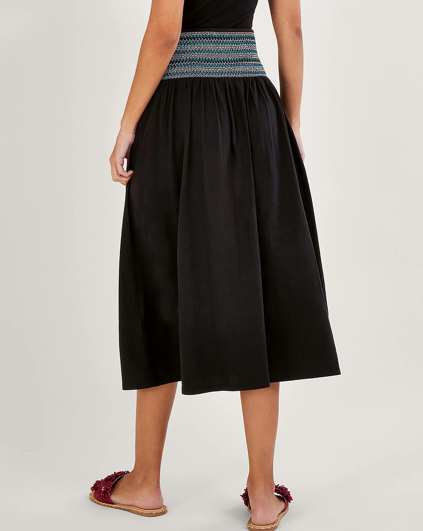 - Fitted with a comfortable shirred waist, this simple skirt falls to a midi length, allowing enough room to show off your woven sandals. Simply style it with a plain tank top for the sweltering July heat.As part of the journey to make our clothes kinder to the world around us, this item was made using more sustainable raw materials, such as organic cotton, recycled polyester and viscose from responsibly grown forests.