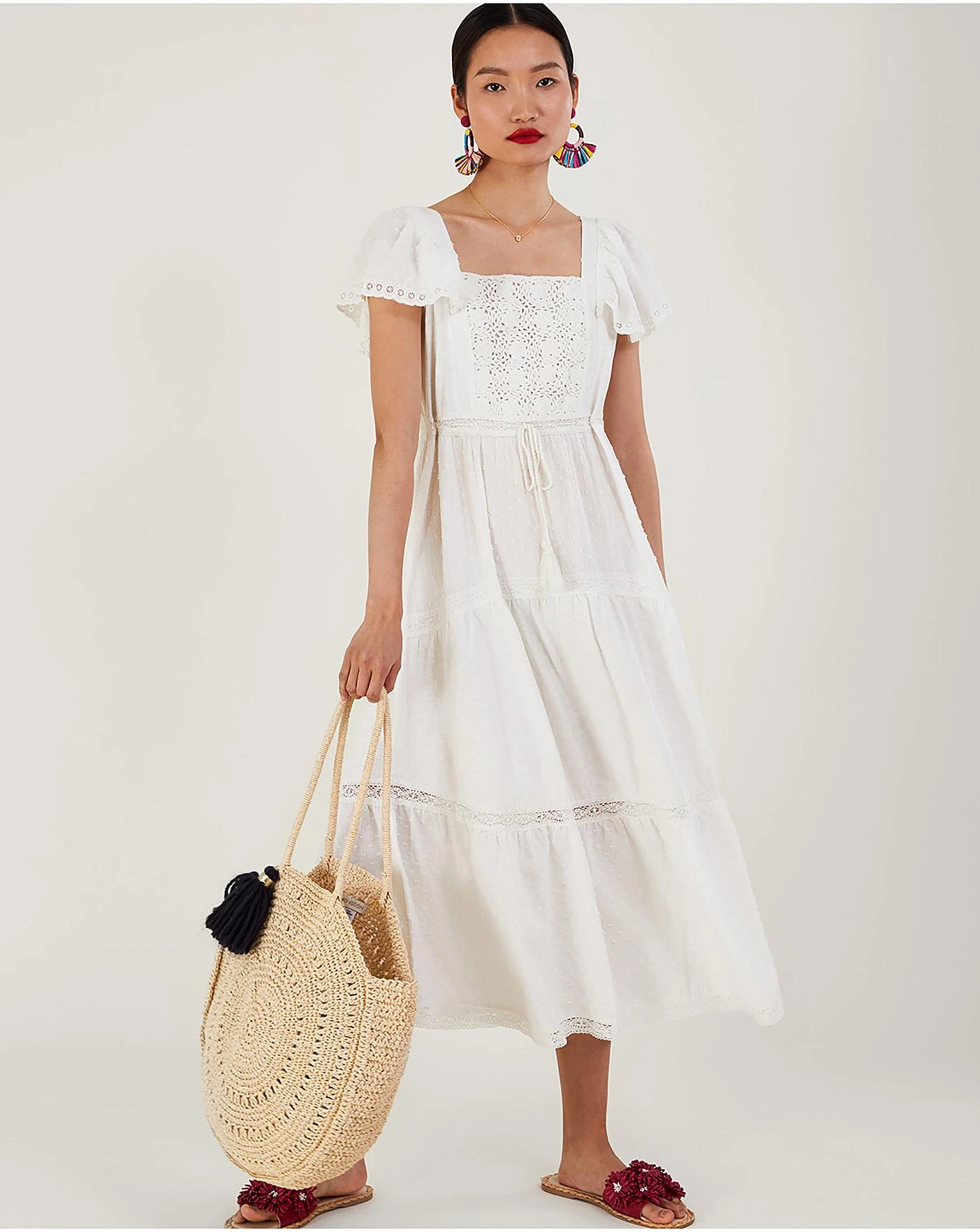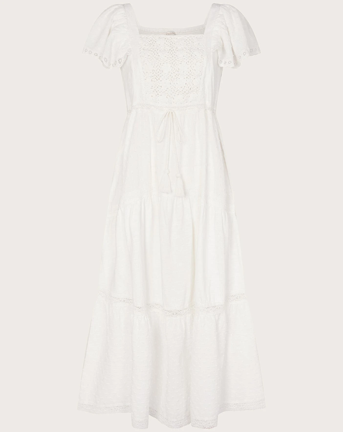 - From broderie anglaise to dobby texture, this piece was made for the sun. Feel the breeze in the flutter sleeves and crochet bodice, before falling into a long tiered midi skirt that hems mid-calf. Finished with lace trims, cinch the waist to your desire with the adjustable tie. Designed with better-sourced cotton. As part of the journey to make our clothes kinder to the world around us, this item was made using more sustainable raw materials, such as organic cotton, recycled polyester and viscose from responsibly grown forests.