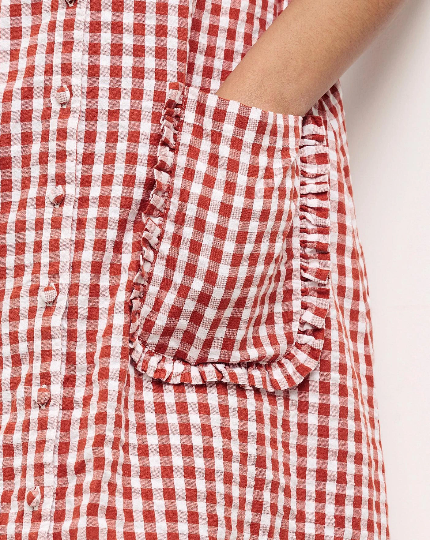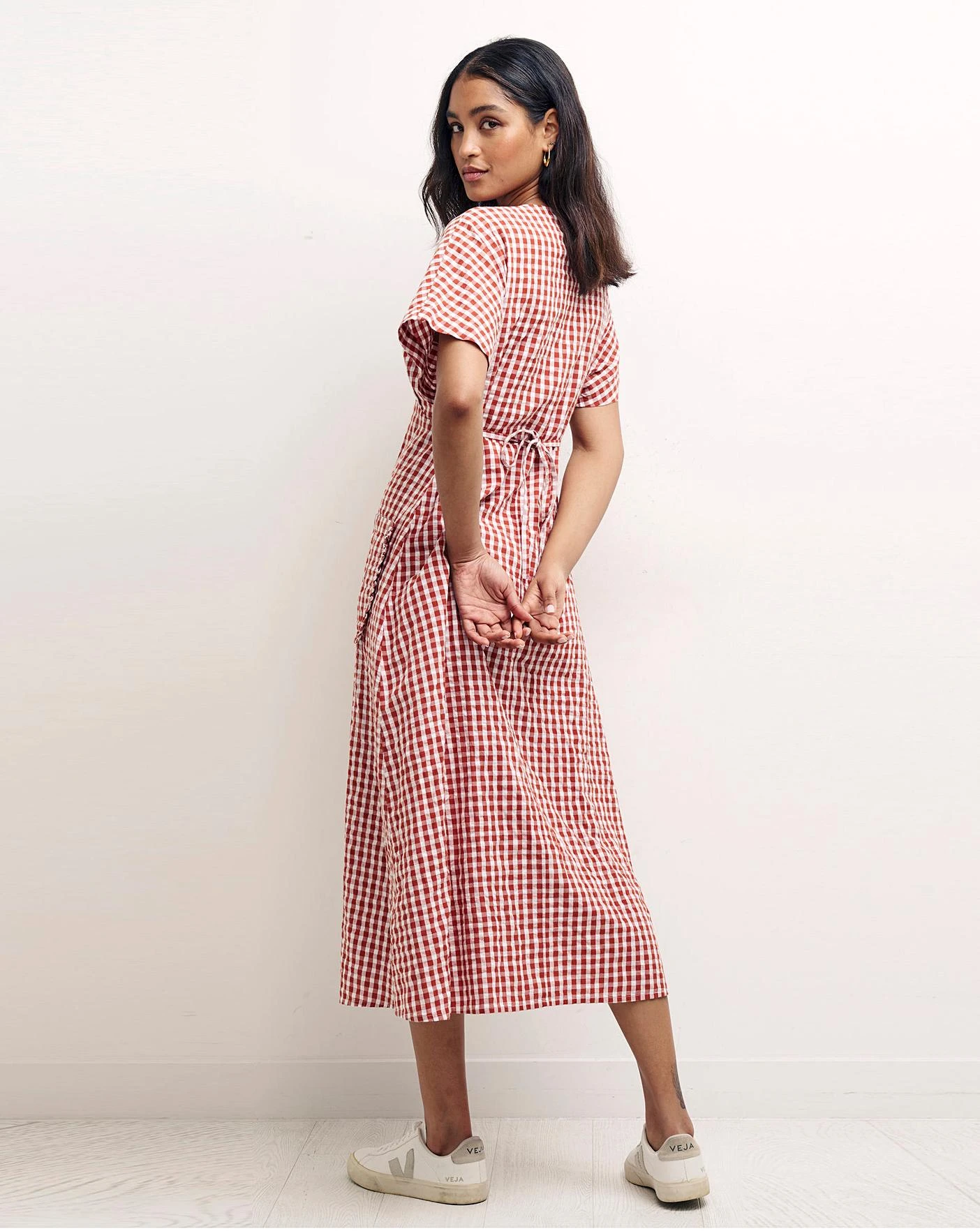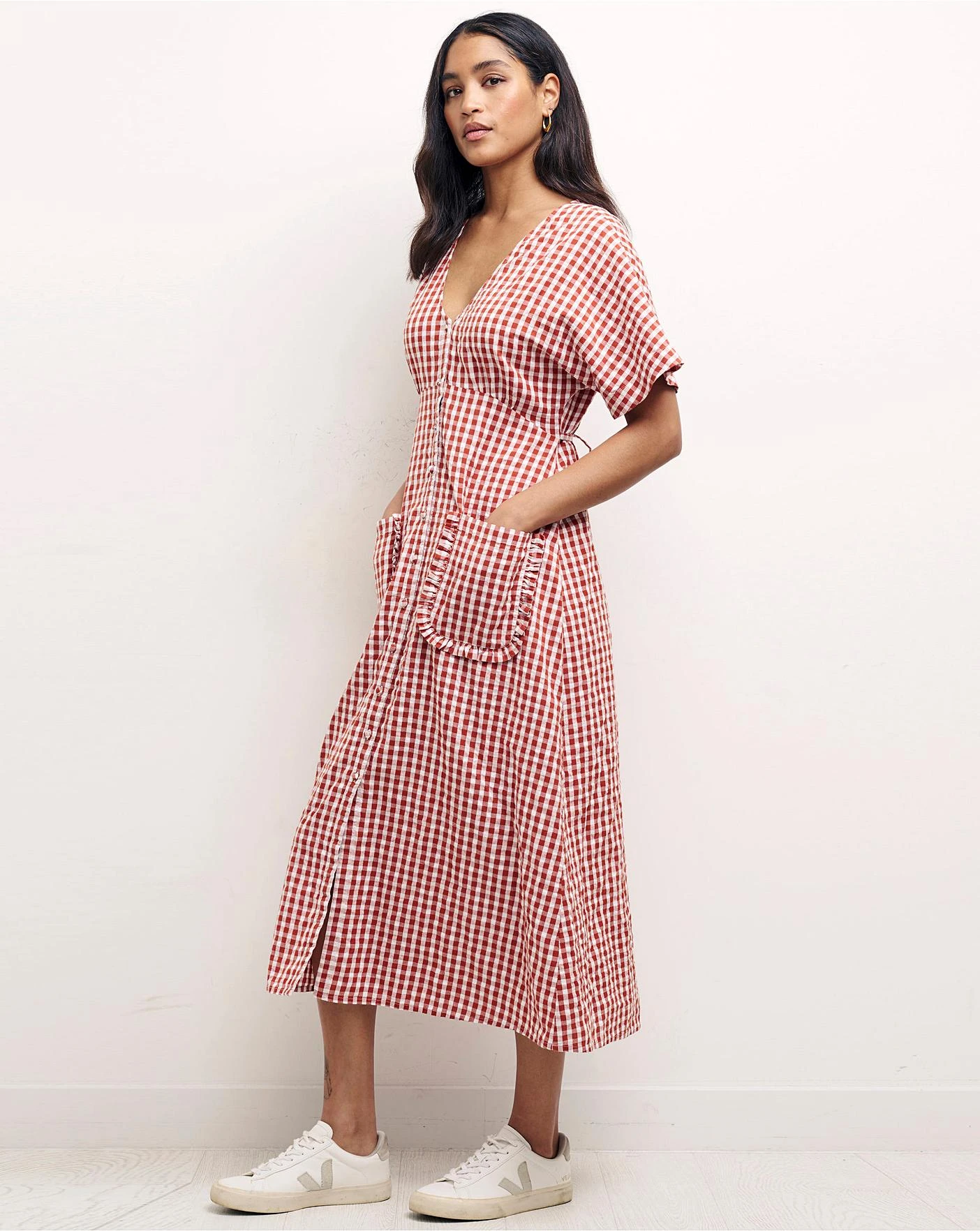 This brown and white gingham, dress is made from seesucker cotton. With a lightly textured feel to the fabric, it’s a stylish choice that offers plenty of breathability in the heat. There’s lots of love about this midi but for us it’s the frill trimmed pockets. Wear yours with responsible tariners fpr days spent running around.