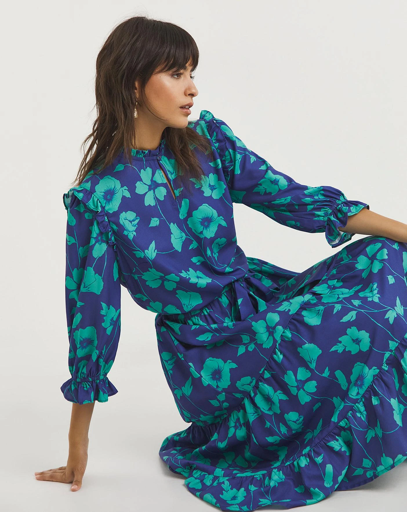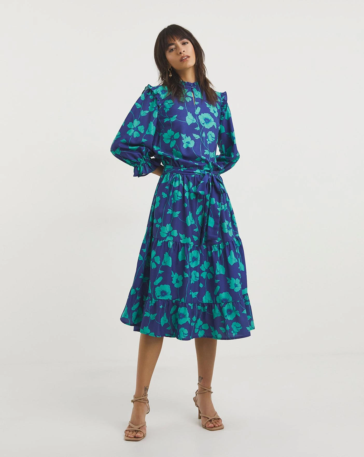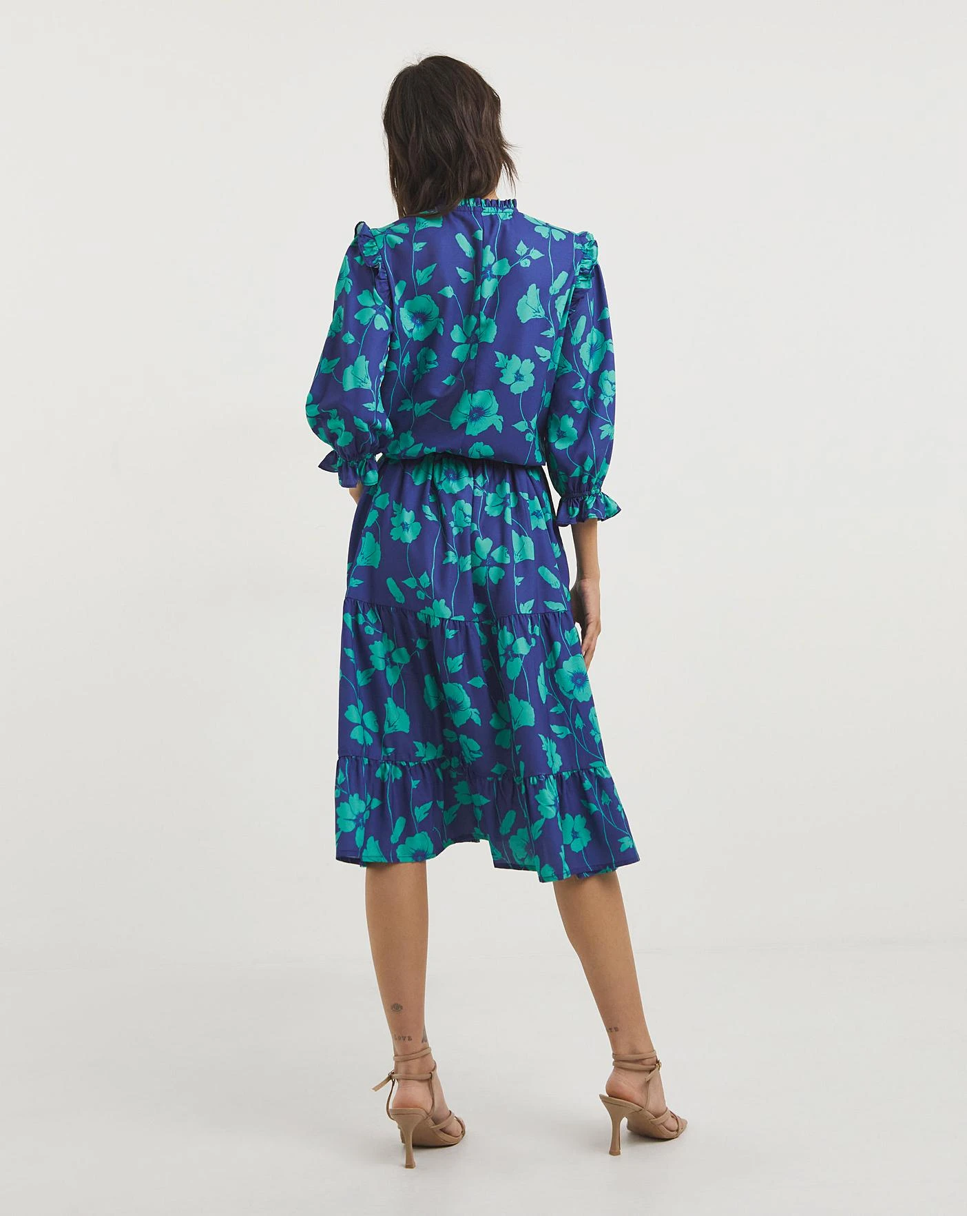 This elegant dress features a floral print in blue tones with three quarter balloon sleeves, frill details and front neck line key hole. The elasticated cuff allows for extra comfort.