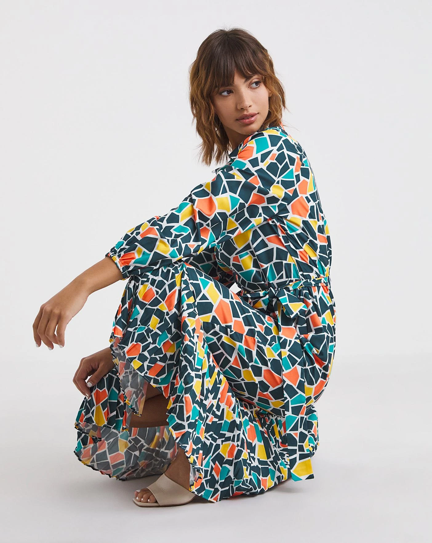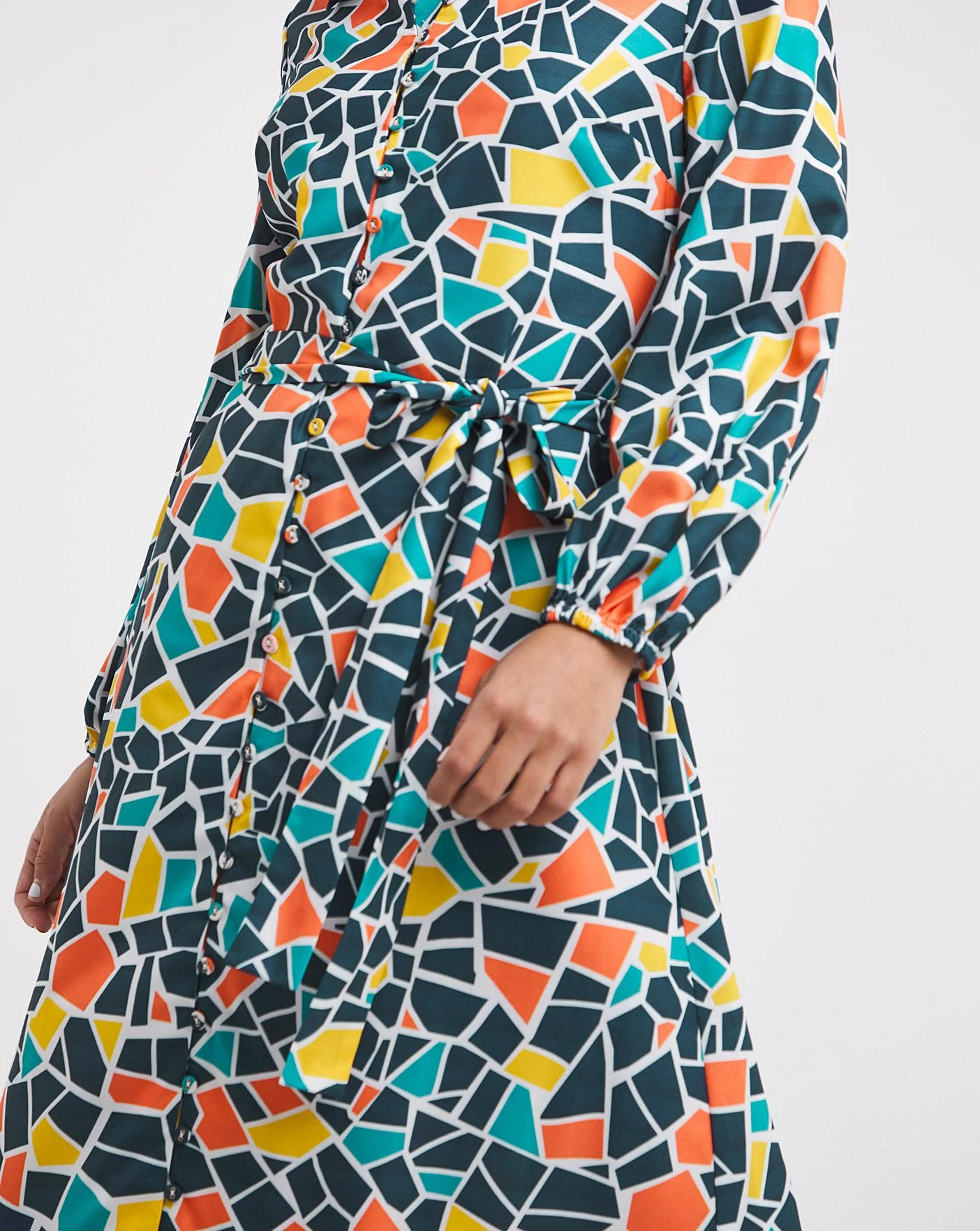 This vibrant blue, yellow and orange geo print dress has a buttoned front and a buckled belt finished with a pleated hem.