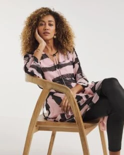 This easy mini dress showcases relaxed femininity at its best. The Deligth tunic is made in our hand painted black and soft pink abstract Selvage print and features a deep V neckline, drawstring waist, long sleeves and a ruffle at the hem. Wear with ankle boots and a leather jacket or wear with sandals. This tunic dress has an oversized fit.