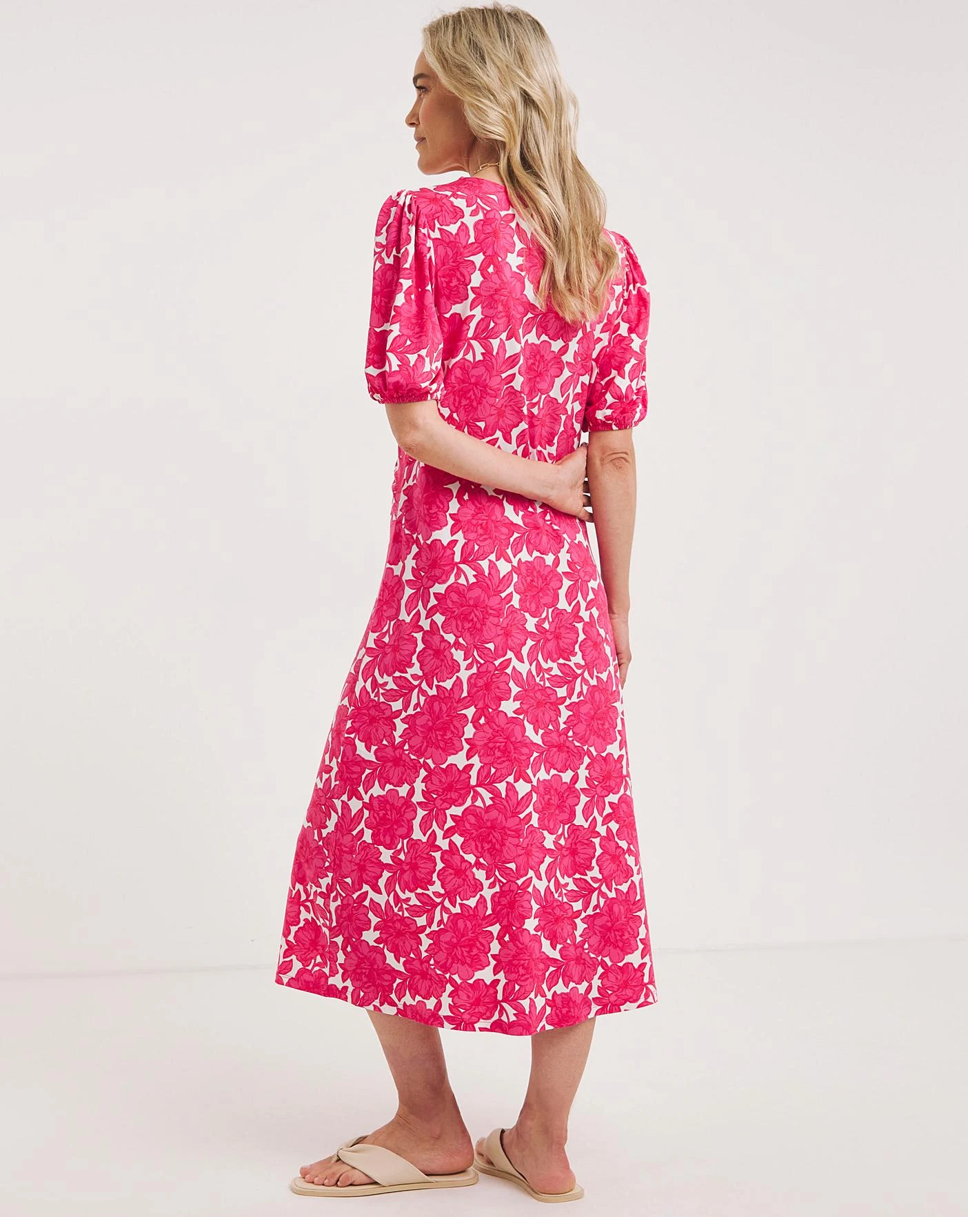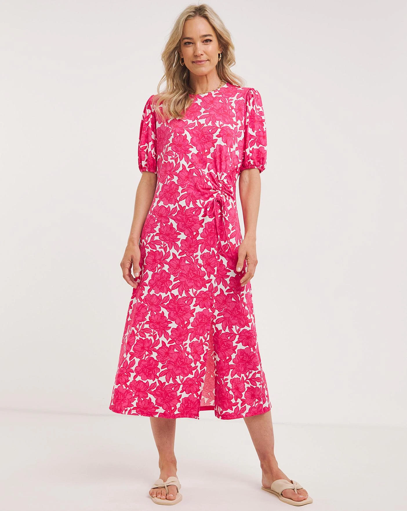 This gorgous dress is perfect for the summer months. In a midi length, this dress features a flattering runched side and short voluminous sleeves.
