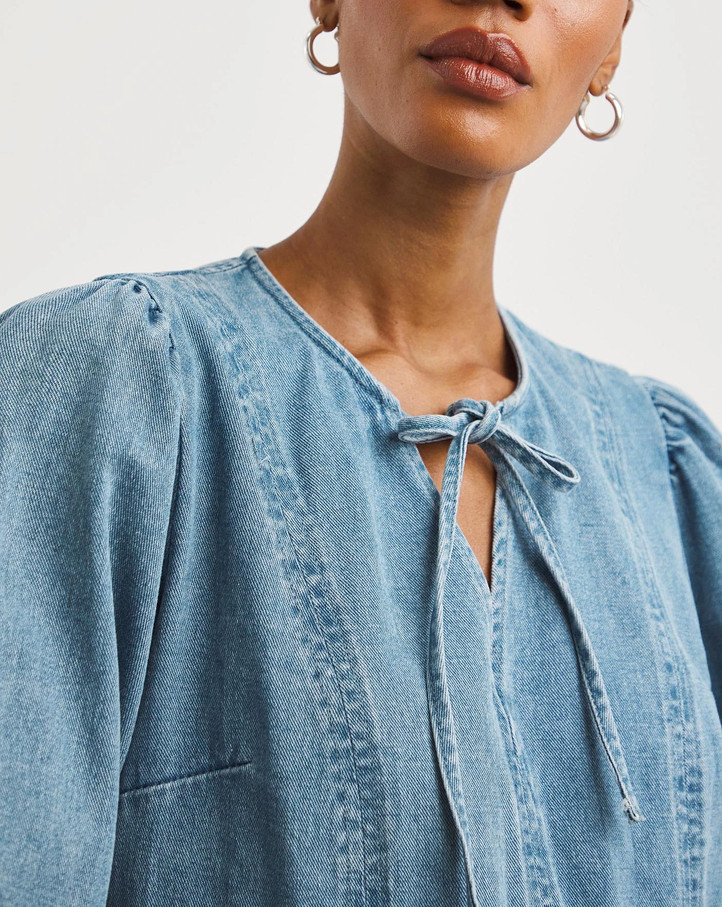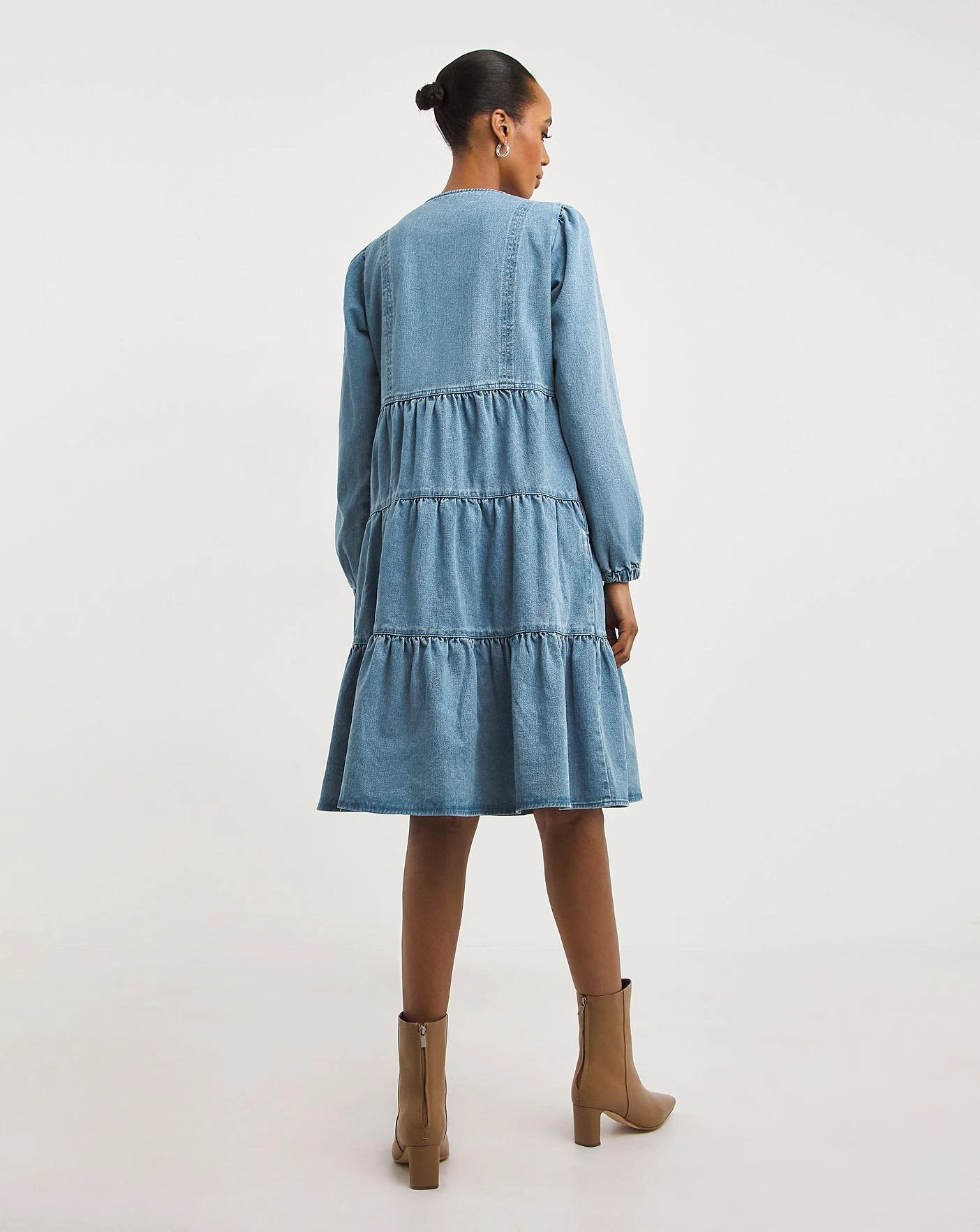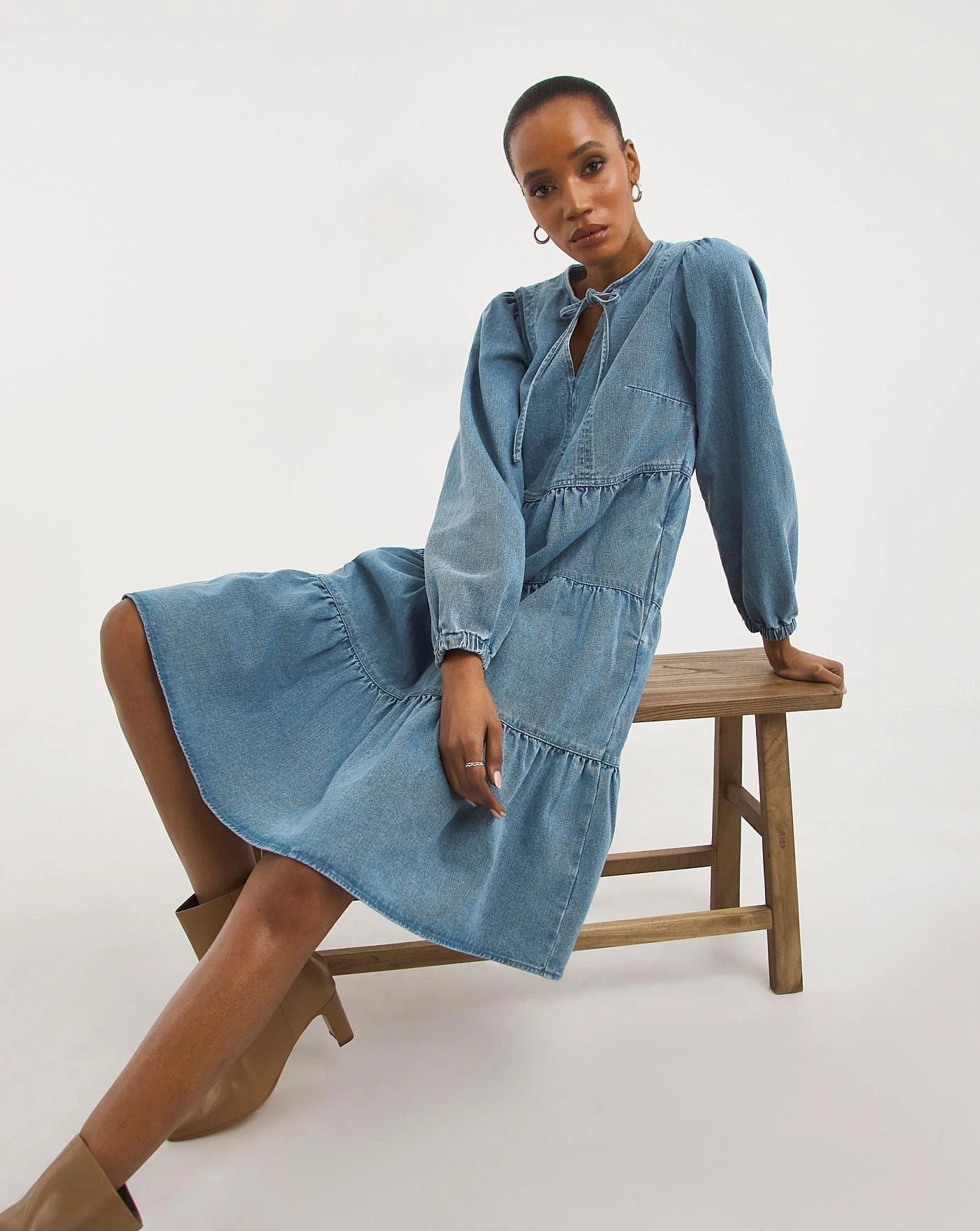 This comfortable cotton denim dress is perfect for dressing up or down with sandals or boots for a feel good look. Featuring a timeless tiered silhouette, elasticated sleeves, seam detailing on the chest and a tie neckline, this dress will make you look and feel amazing!