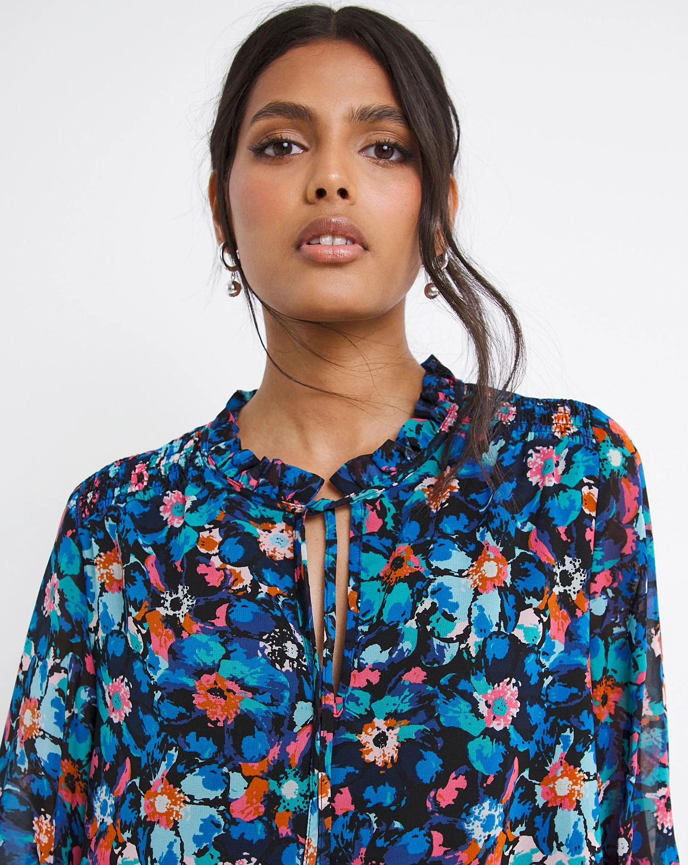 Our best-selling shape re-designed for spring-summer dressing. In a gorgeous, blue-based floral and in an effortless smock shape, this dress falls to a flattering knee length, complete with a gently tiered hem. Featuring 3/4 sleeves with an elasticated cuffs, a matching ruffle neck with a functional tie, and shirred panel detailing on the shoulder.
