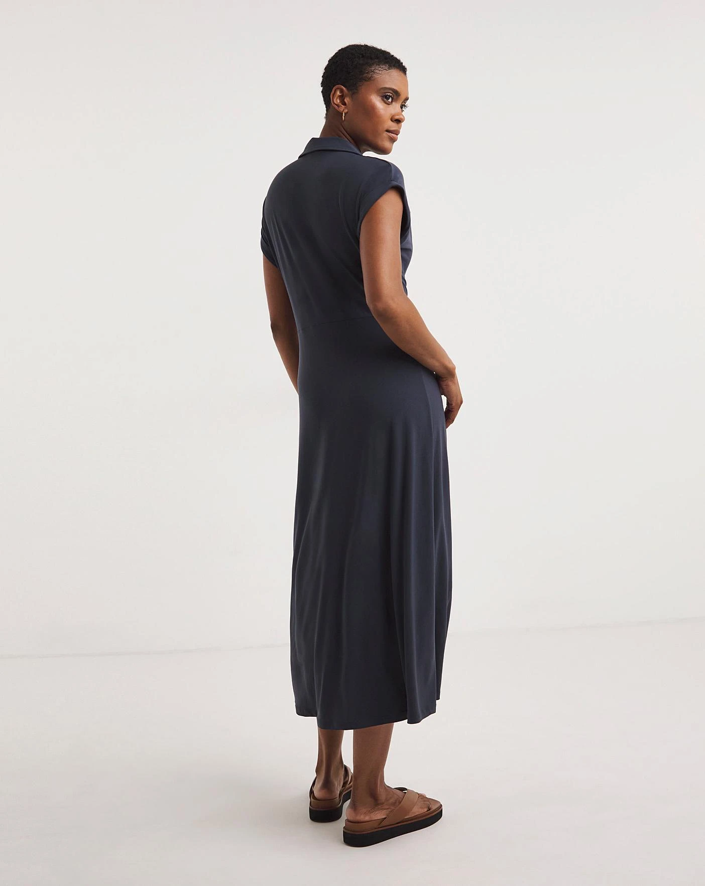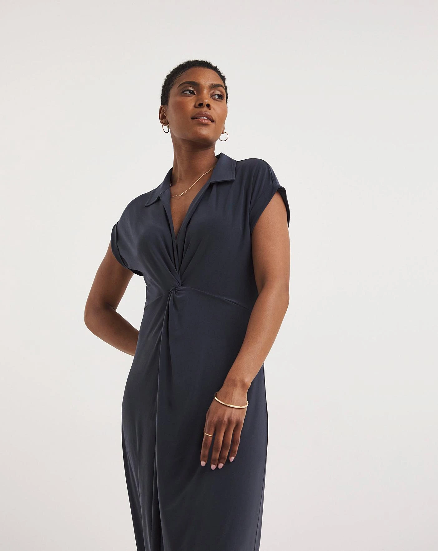 In a midi length, this twist front midi dress features a collar detail, and short cap sleeves. Perfect for summer time, style this dress with sandals.