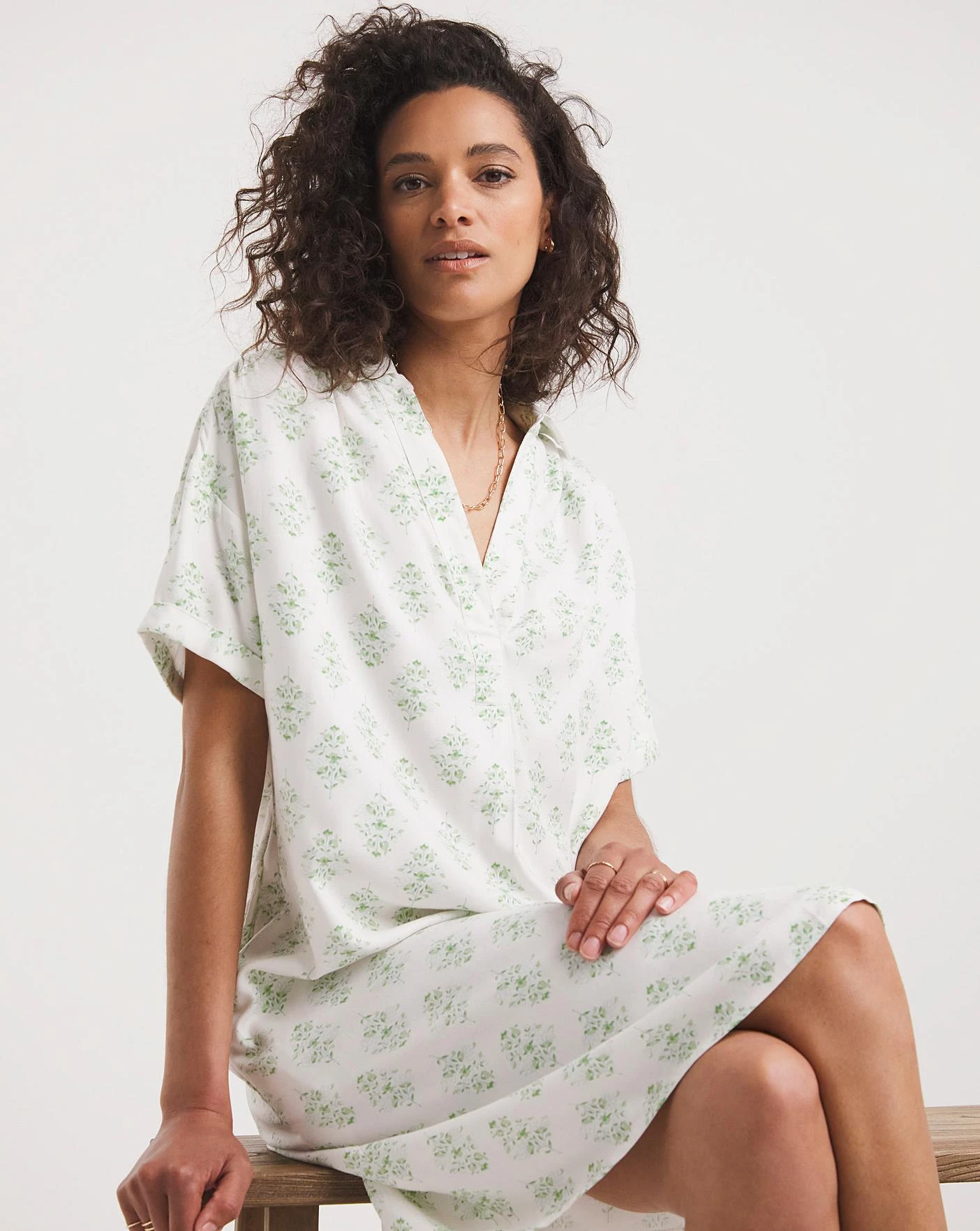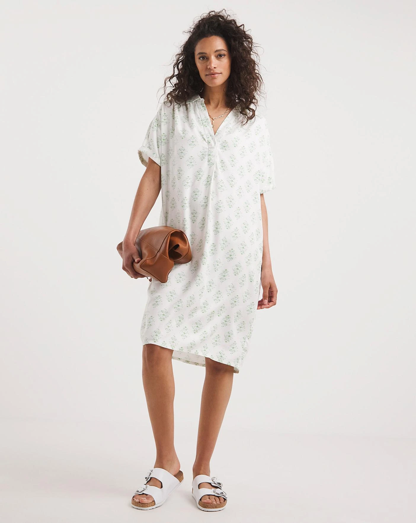 Cut from a super soft viscose twill fabrication, our Relaxed Open Collar Shirt Dress is a smart, easy throw-on dress. In a soft Green Print, this dress has been designed with a feminine open neck button-less collar, turn-up sleeve detailing, and side seam pockets. Complete with gentle pleats across the front shoulders.