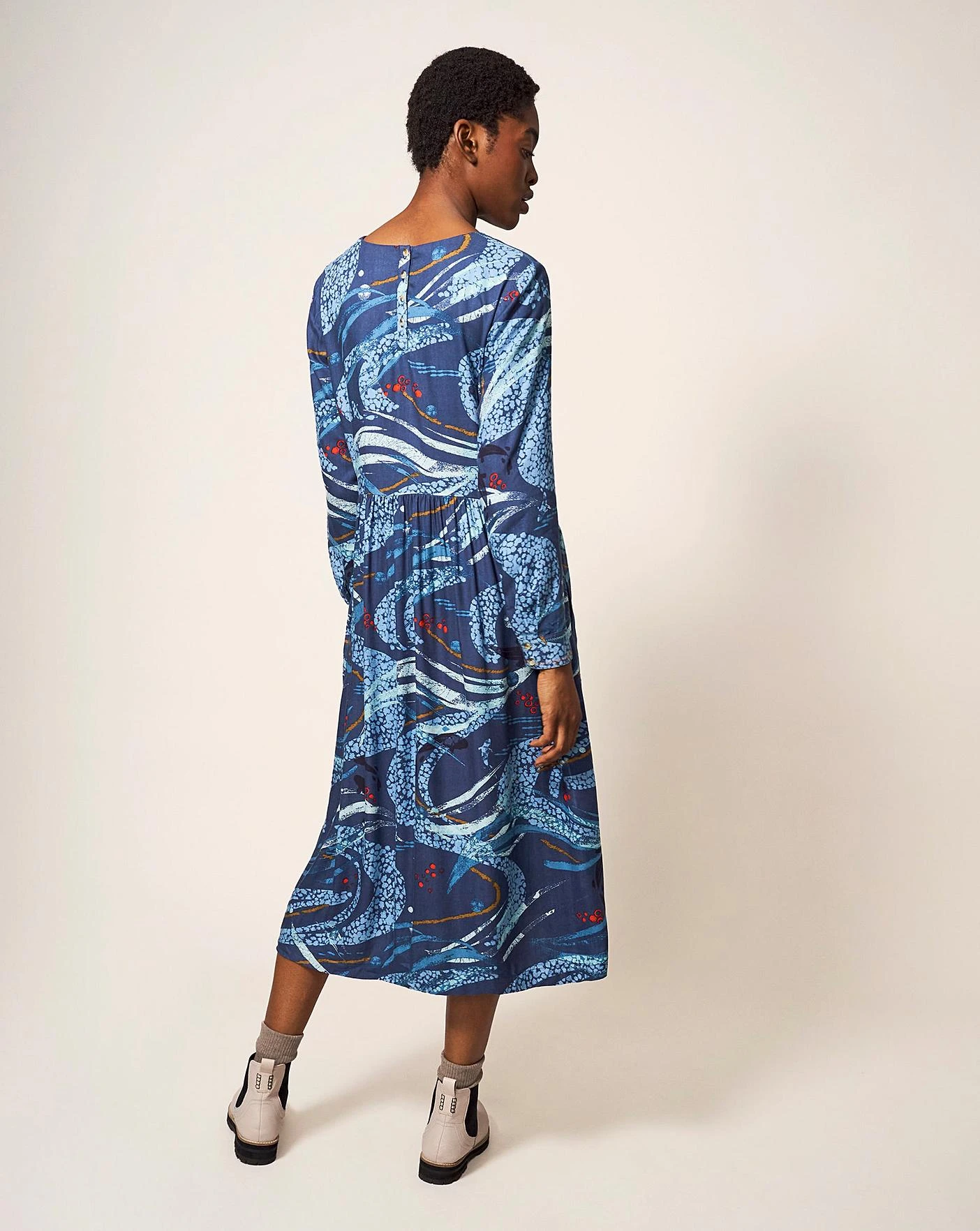 If you can’t get to the sea, bring the sea to you. This flowy midi dress long sleeves, a drop waist and a swirling aquatic pattern. We feel relaxed just looking at it.